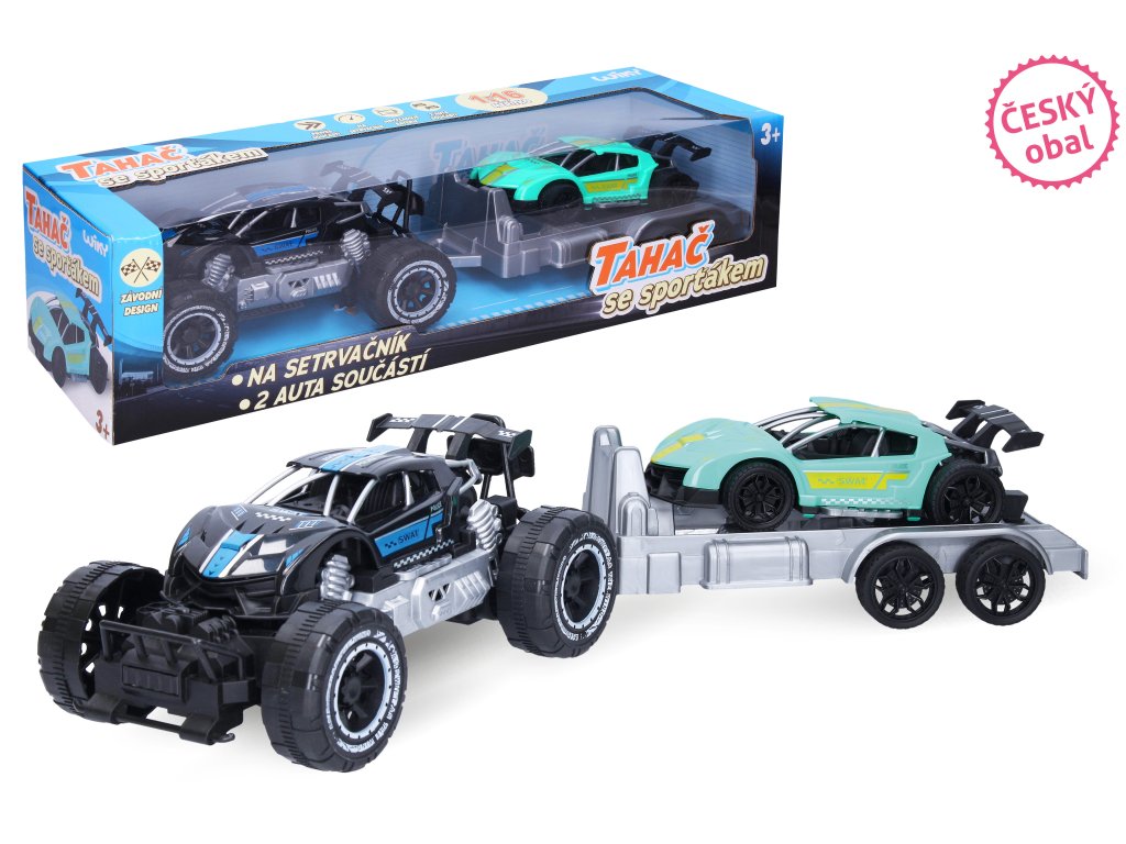 Tahač s autem. Rozměry 45x12,5x9,5 cm. Obě auta na setrvačník. Jen barevná varianta - větší auto černé, menší zelené.
