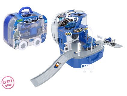 Auto policejní s efekty a 6 malými auty. Rozměry velkého auta 34x12,5x18,5 cm, velikost malých aut 7-8 cm. Volná kola. Světelné a zvukové efekty červeným tlačítkem na kabině.