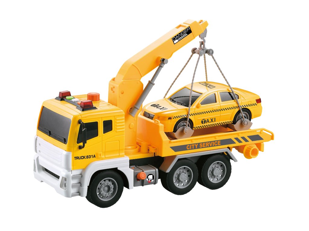 Tahač s taxíkem a efekty. Rozměry 30x13x17 cm. Na setrvačník. Světelné a zvukové efekty tlačítky na kabině tahače. 3xAG13 baterie součástí. Velké oranžové tlačítko na kabině - hydraulika nakládacího ramene - zvedání. Oranžová páčka mezi koly položení (uvolnění) nakládacího ramene.Doplňkové parametry