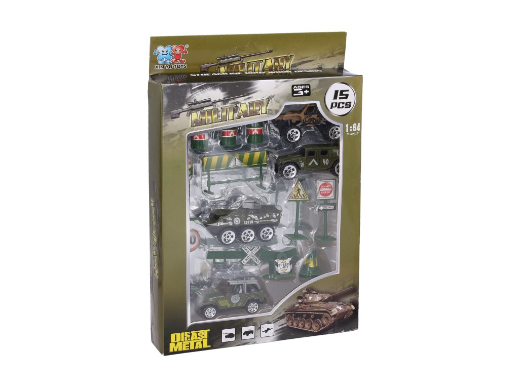 Vojenský set. Velikost dopravních prostředků 7 cm. Volná kola. 4 kovové dopravní prostředky, značky, zábrany, kužely, barely a další.