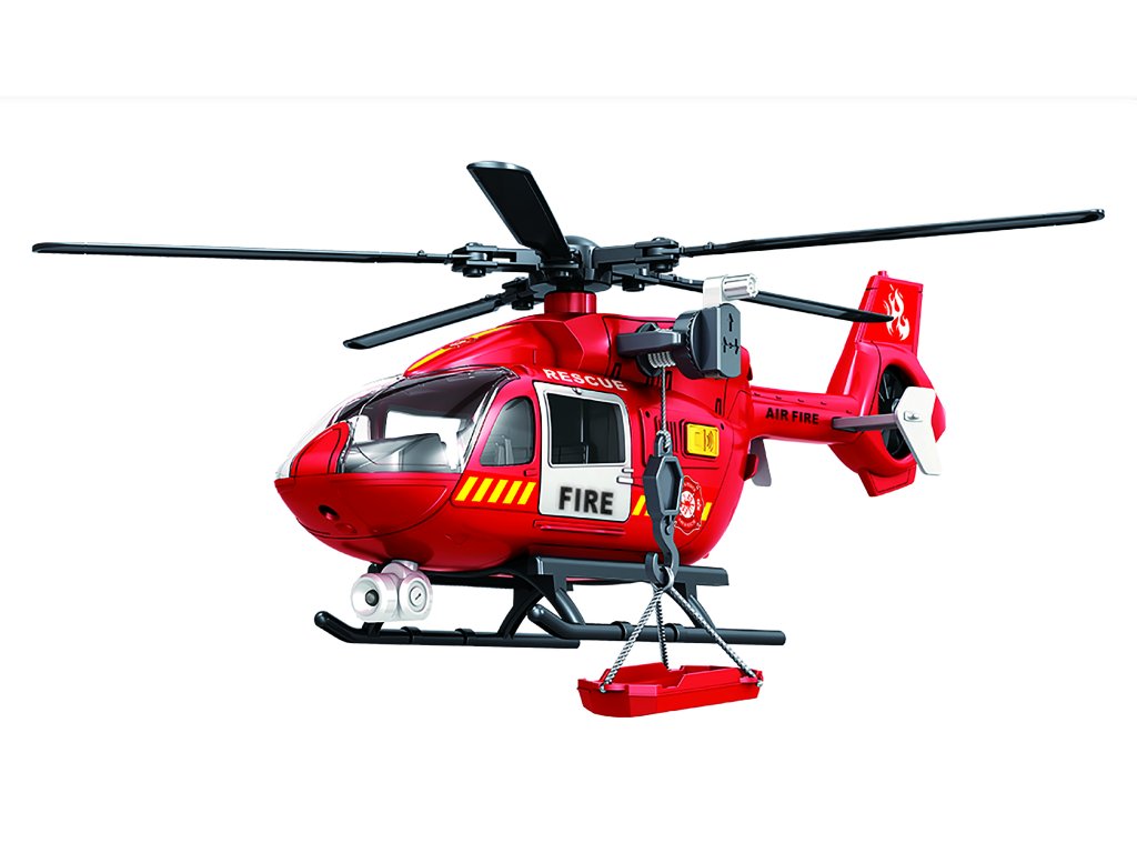Vrtulník hasičský s efekty. Rozměry 38x12x16 cm. Světelné a zvukové efekty tlačítkem na boční straně vrtulníku.