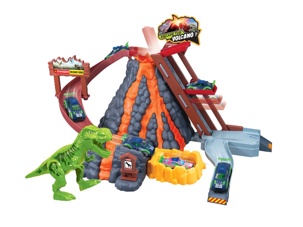 Autodráha sopka s autem měnícím barvu. Obrázkový návod na sestavení v balení. Dráha obsahuje sopku s vysunovací lávou, výtah pro autíčko, sjezd a vodní lázeň pro změnu barvy auta. Teplá voda změní barvu auta, studená mu vrátí barvu původní.