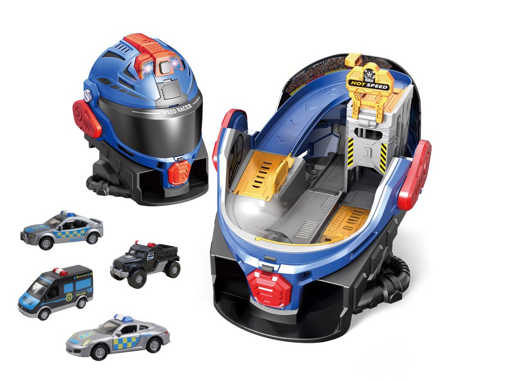 Policejní stanice helma. Rozměry 20x32x20 cm. Vydává světelné a zvukové efekty. Aktivace tlačítkem na helmě.