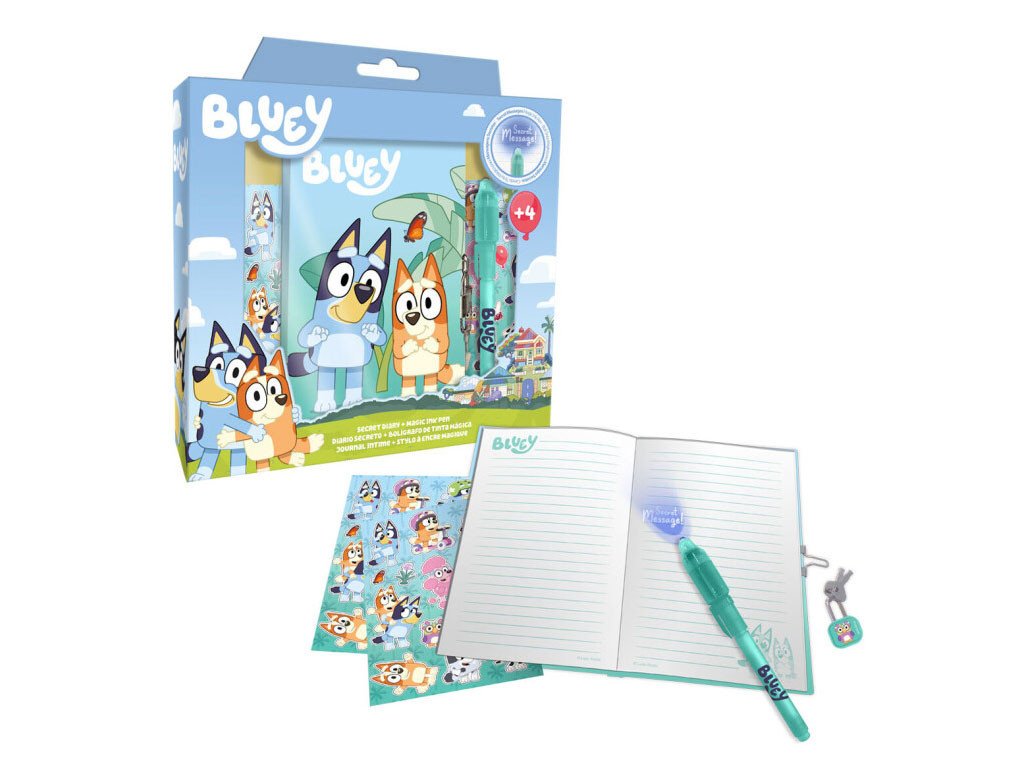 Stylový set deníku a kouzelného pera Bluey je ideální pro děti, které rády zapisují své myšlenky, zážitky a tajemství. Design s oblíbenými postavičkami Bluey a Bingo zaujme na první pohled a promění psaní v zábavnou a kreativní aktivitu. Kouzelné pero umožňuje psát skryté zprávy, které lze přečíst pouze speciálním světlem, což přidává hře i psaní jedinečný rozměr.