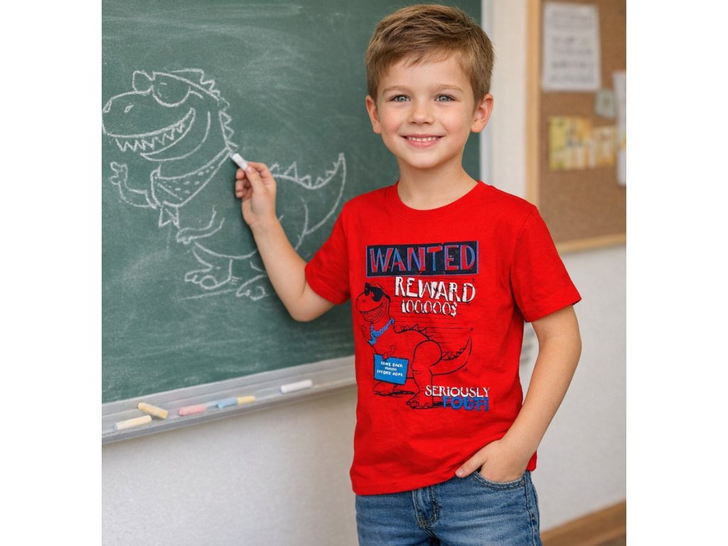Tričko pro kluky s potiskem dinosaura. Bavlněné tričko je velmi pohodlné a příjemné díky kvalitní bavlně a klasickému střihu, který sedí a nebrání v pohybu. Jako bonus má motiv doplněn barevnými pogumovanými, lehce 3D vystupujícími prvky, které tričku dodávají šmrnc a zajímavost. Tričko je vhodné pro každodenní běžné aktivity dětí. Do školy, do školky, na doma i na sport.