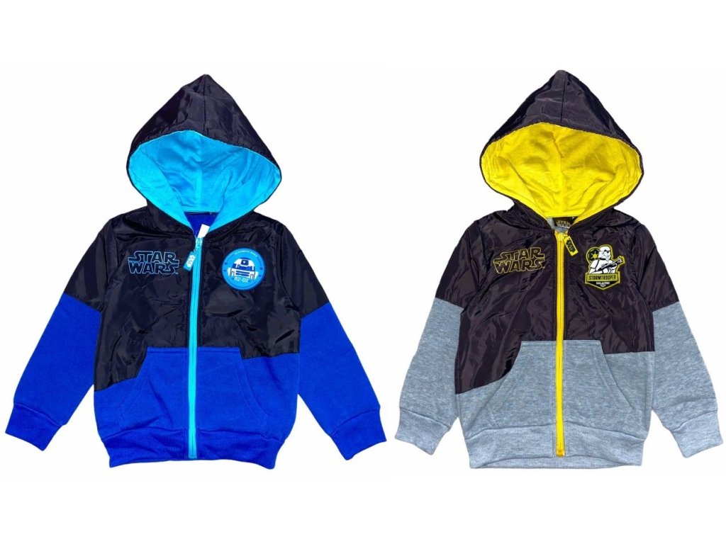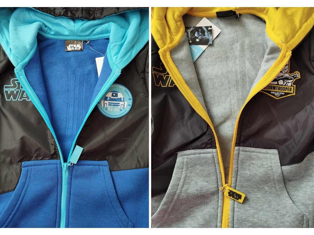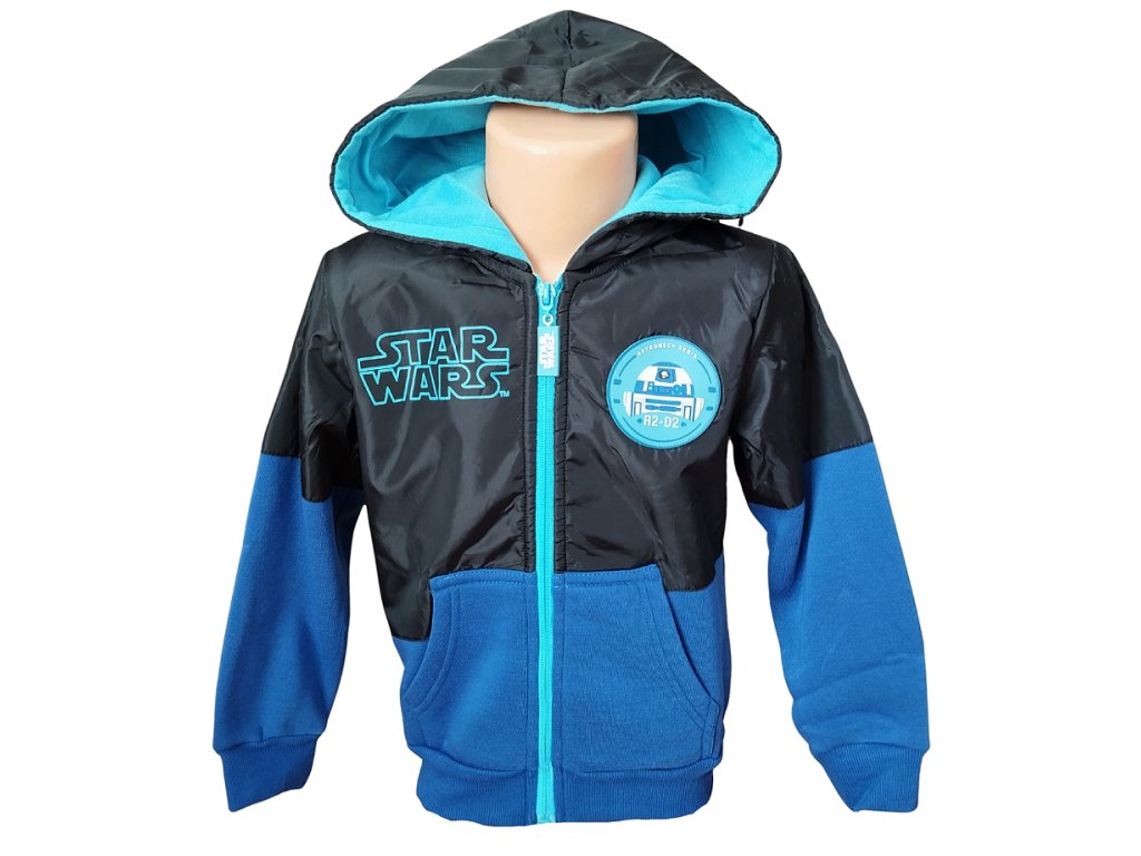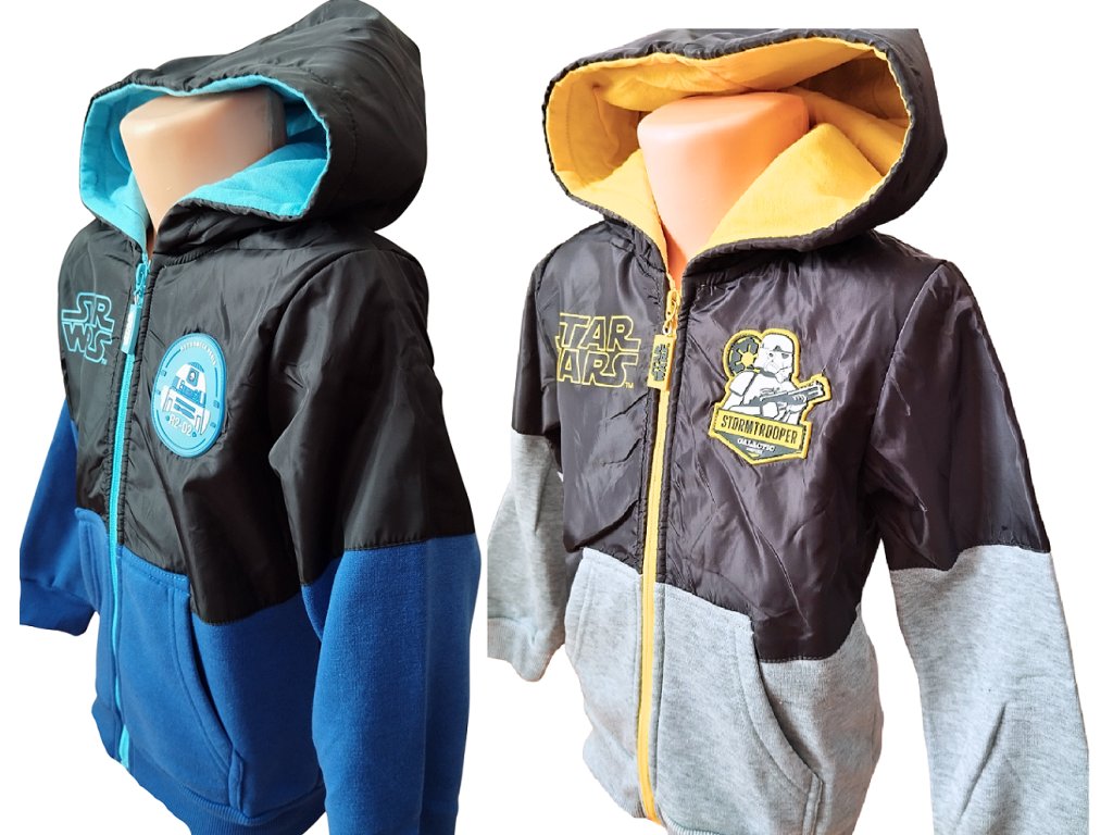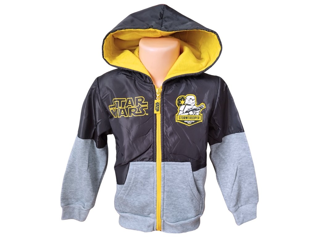 Parádní kousek do šatníku kluků, který se hodně líbí. Velmi zdařilá mikina - bunda, která je vhodná pro jarní, chladnější letní a naopak teplejší podzimní období. Bundomikina má horní polovinu dvojvrstvou, vrchní vrstva je tvořena šusťákem, na kterém je nádherná velká gumová aplikace s tematikou Star Wars. Zapínání je na zip s 3D ozdobou na jezdci. Nechybí ani břišní kapsy a kvalitní pružné manžety.