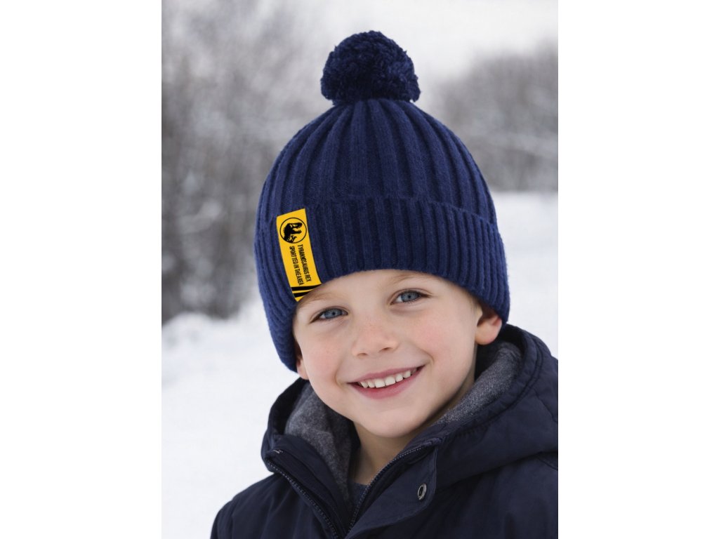 Dětská zimní čepice Jurský svět je lehčí pletená čepice vhodná pro podzimní a zimní dny. Je vyrobena z velmi pružného úpletu, doplněna bambulí a žlutou nášivkou s logem tyranosaura. Materiál je příjemný na dotek a nezpůsobuje podráždění pokožky.