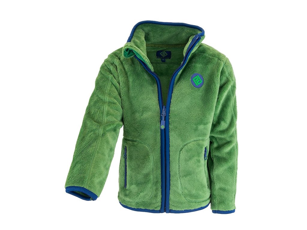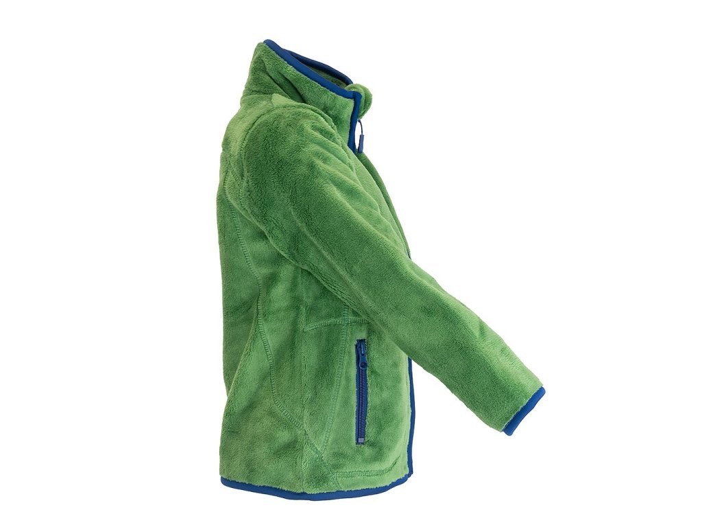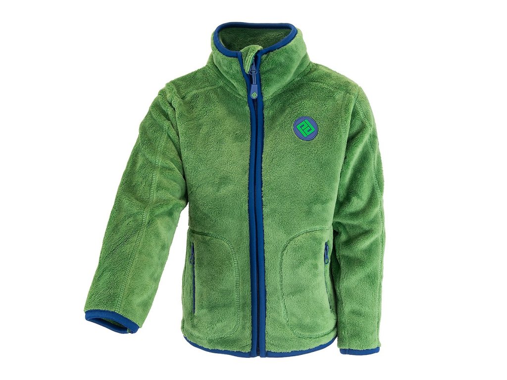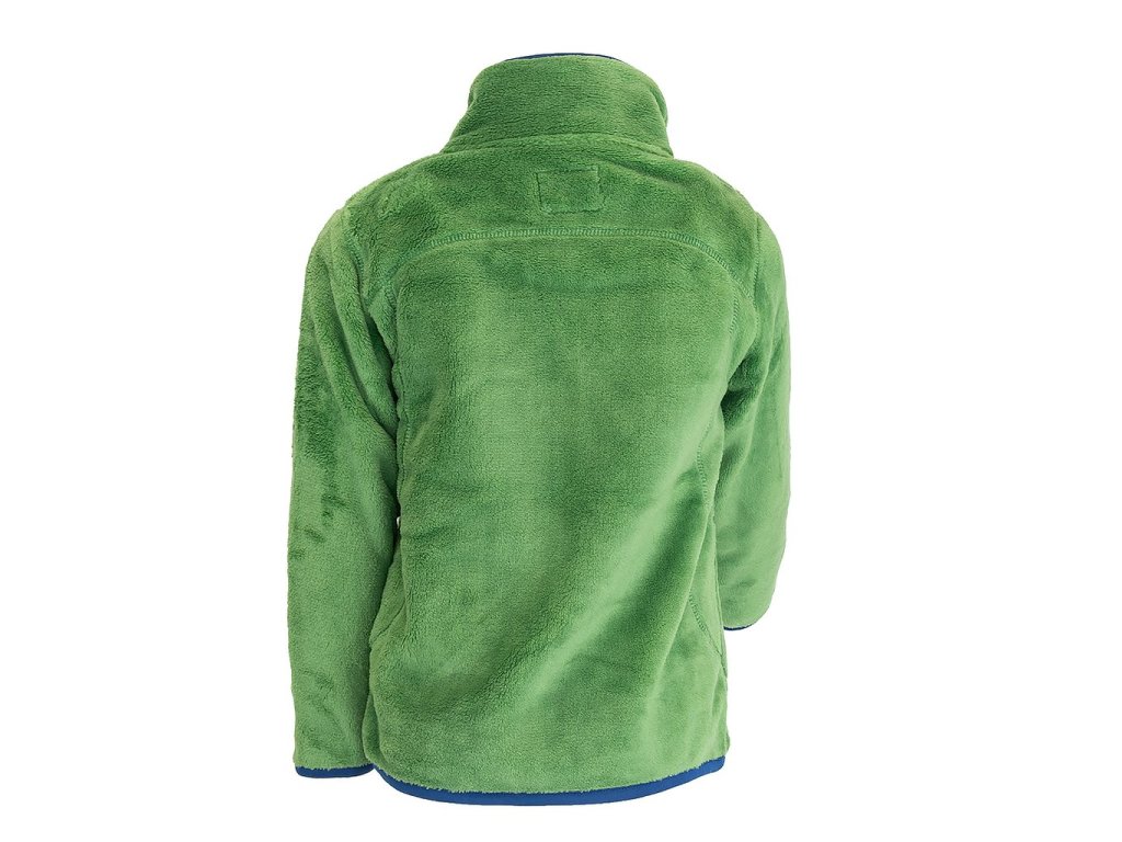 Dětská propínací chlupatá mikina v zelené barvě. Stojací límec, dvě kapsy, barevné kontrastní lemy.
