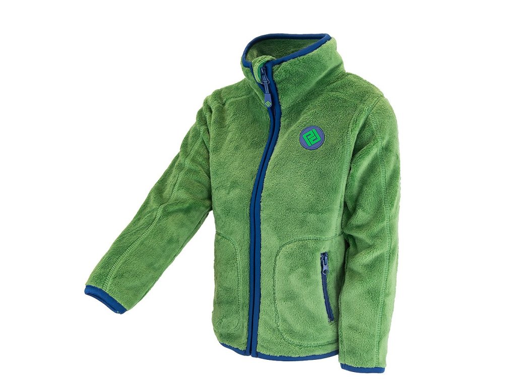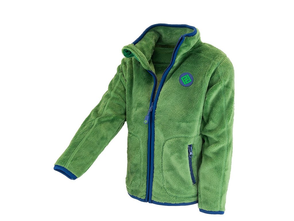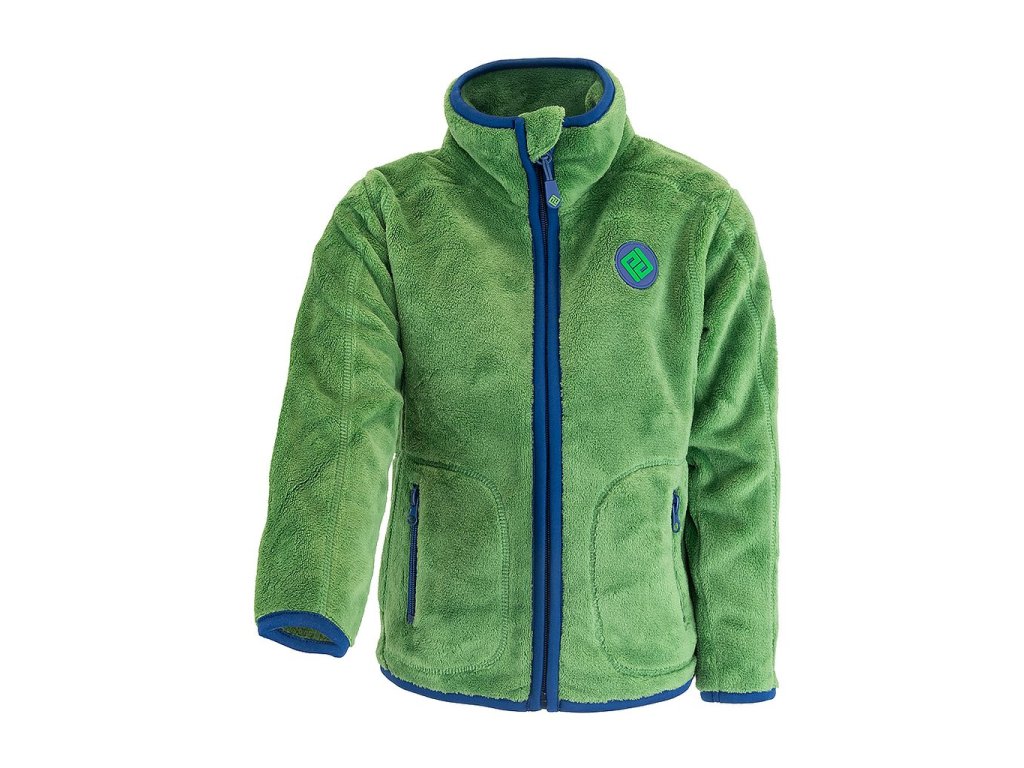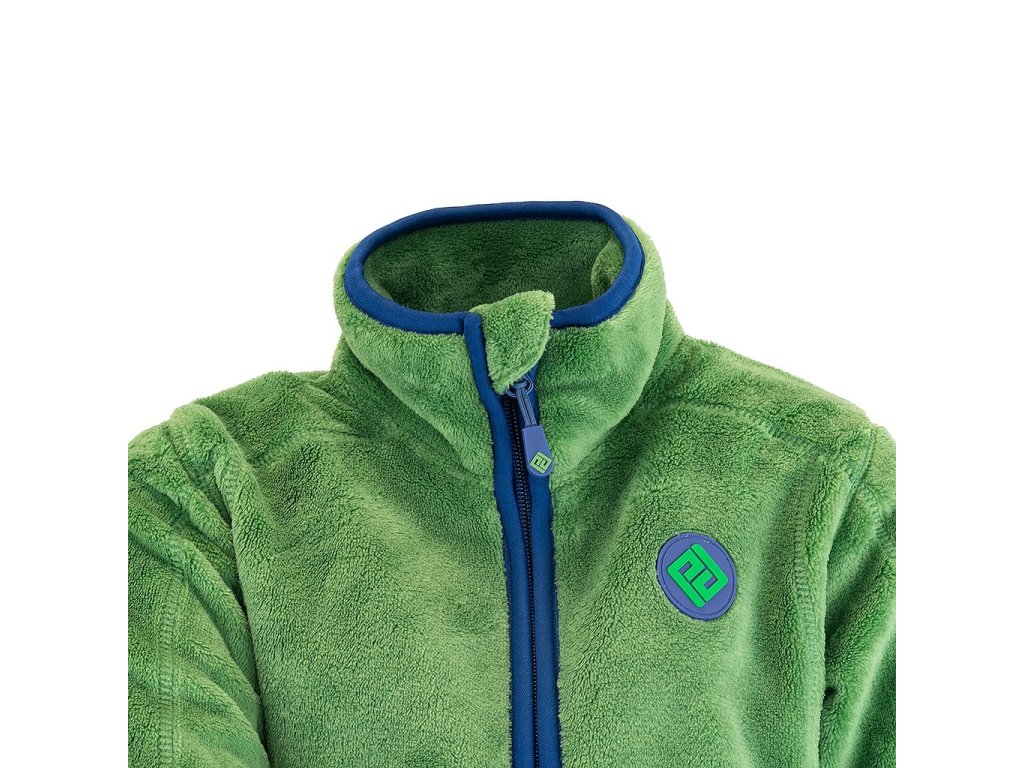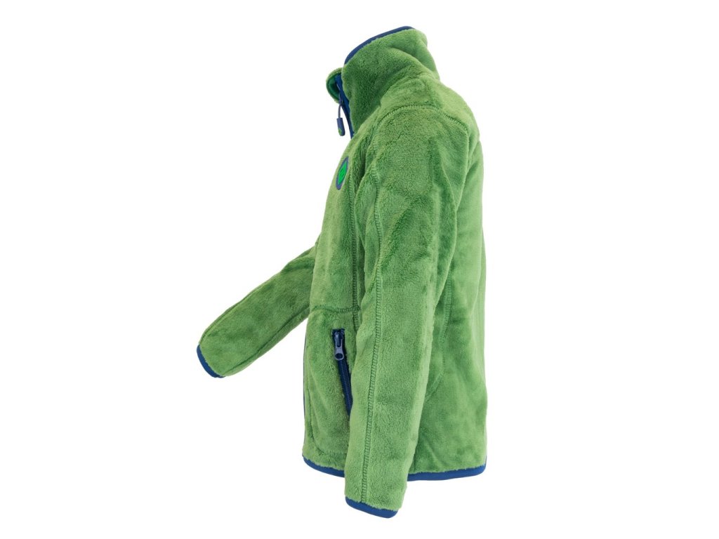 Dětská propínací chlupatá mikina v zelené barvě. Stojací límec, dvě kapsy, barevné kontrastní lemy.