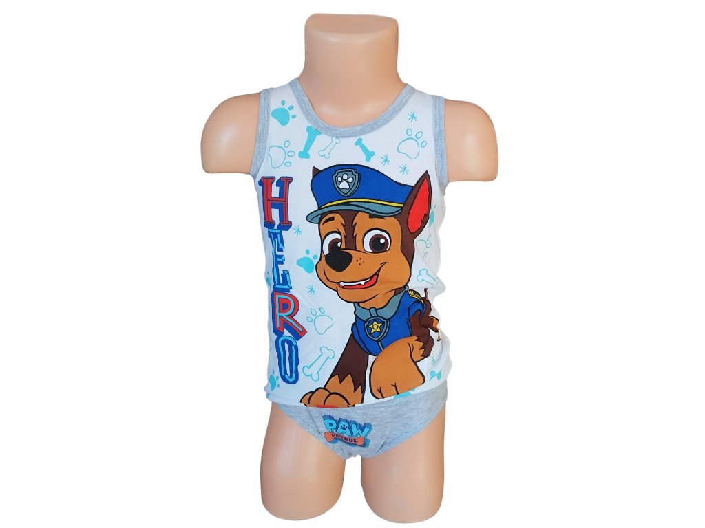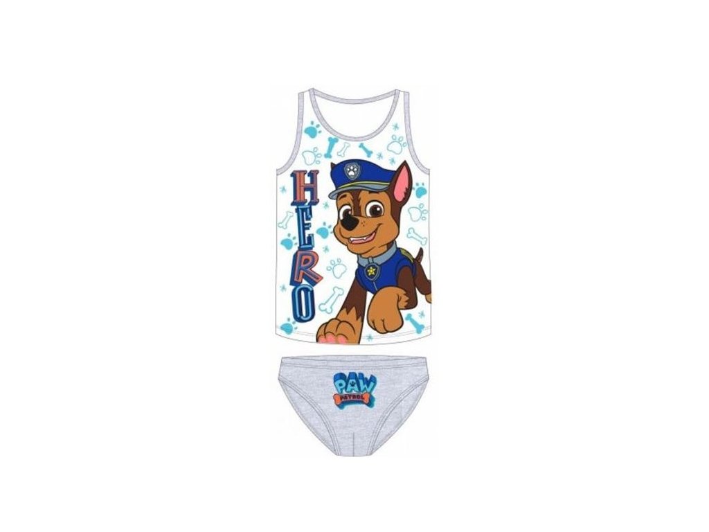 Bavlněný set spodního prádla Paw Patrol pro kluky. Velmi příjemný set s Chasem, který je krásně pružný, slipky mají pohodlné neškrtící gumičky a motiv na tílku je celolátkový.