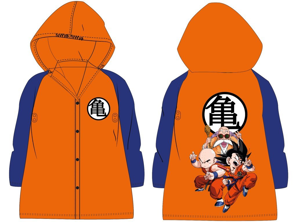 Chlapecká pláštěnka Dragon Ball v ikonické oranžovo-modré kombinaci potěší každého malého fandu anime hrdinů. Díky výraznému designu s motivem oblíbených postav Dragon Ball bude dítě chráněné před deštěm a zároveň nepřehlédnutelné.
