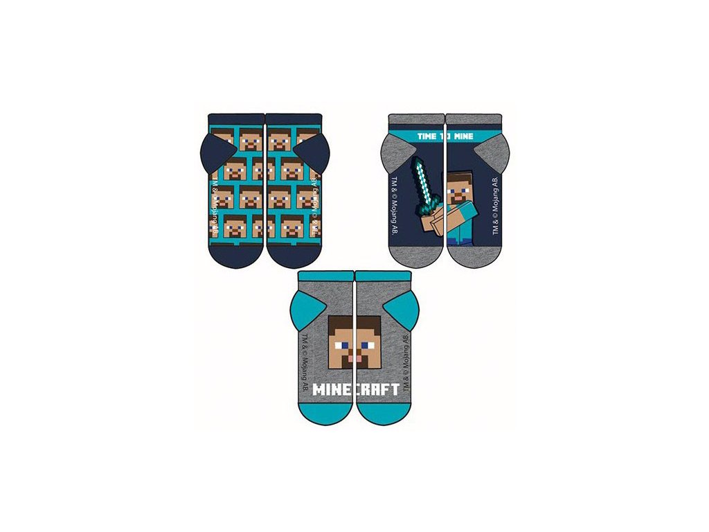 Praktické chlapecké kotníkové ponožky Minecraft v kombinaci šedé a modré barvy jsou vhodné pro každodenní nošení do školy, na sport i volný čas. Balení obsahuje 3 páry s různými motivy, které zdobí postavička Steve a pixelová herní grafika. Krátký střih dobře sedí v teniskách a sportovní obuvi.