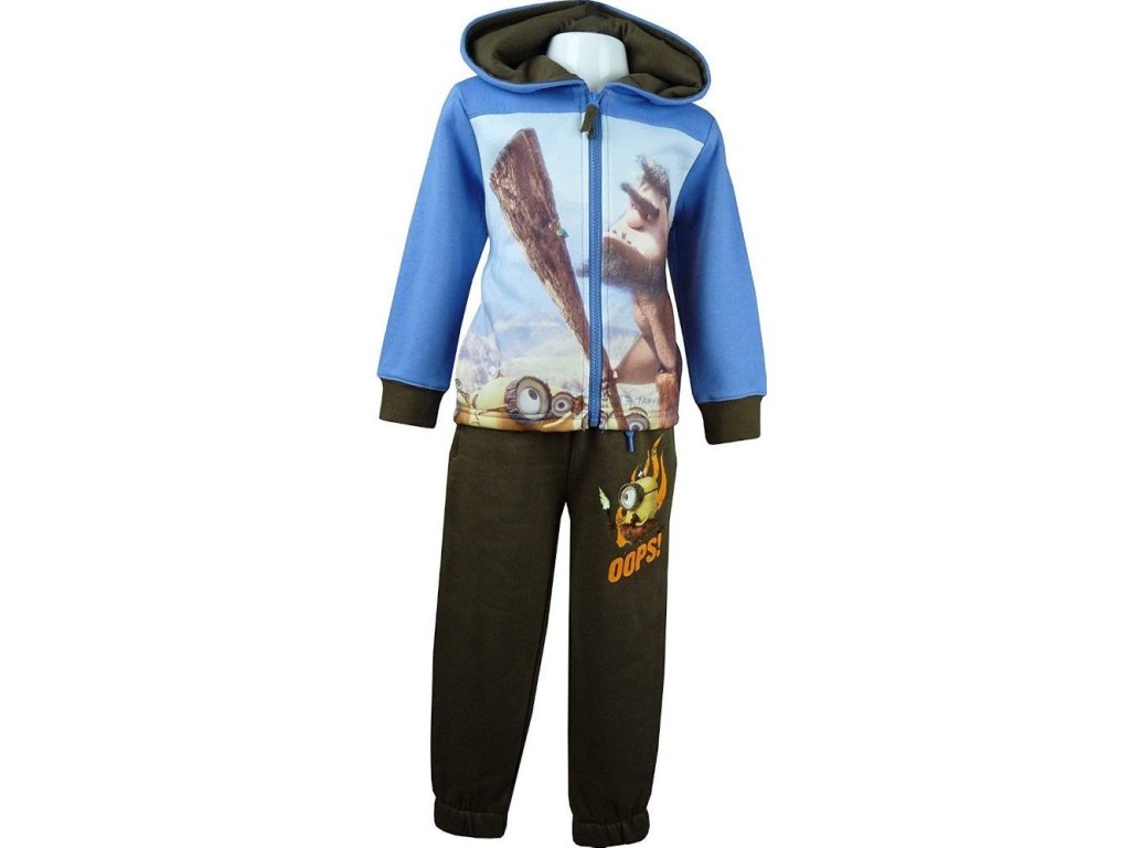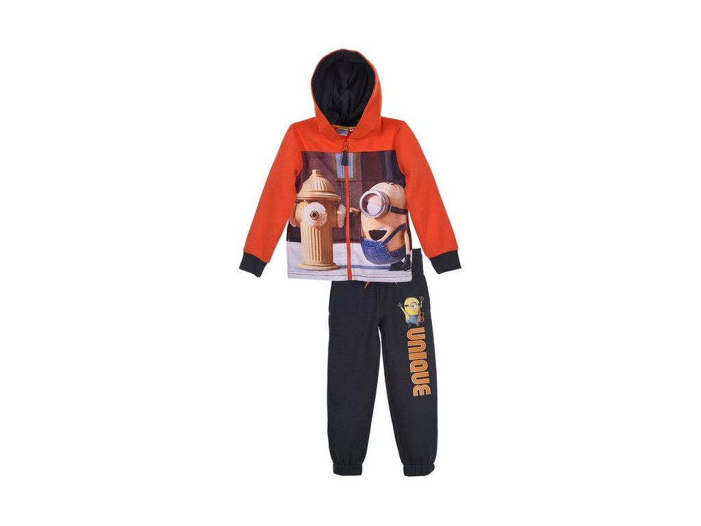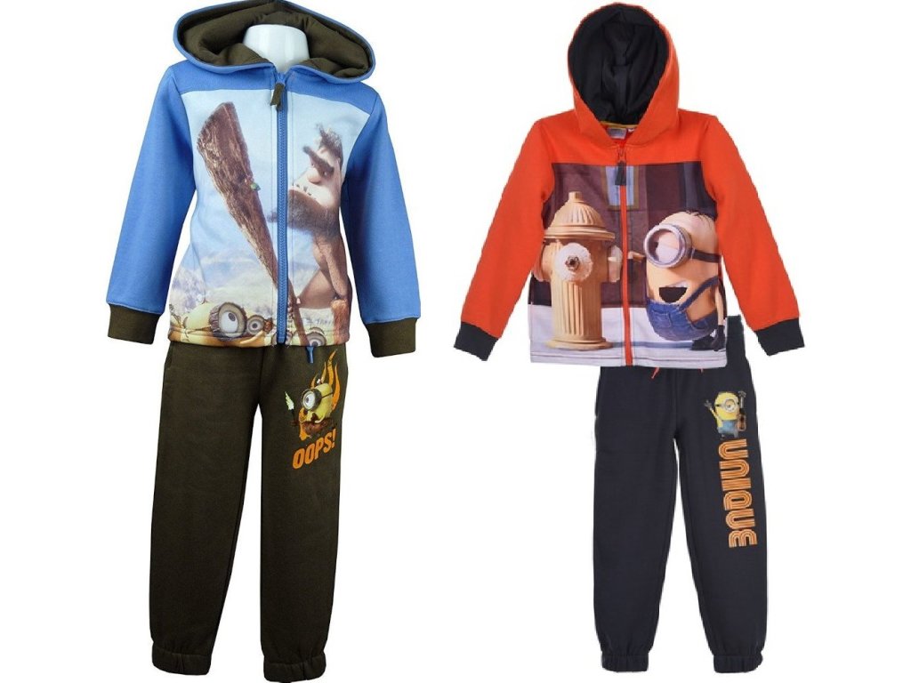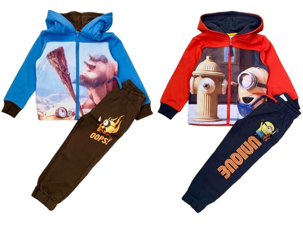 Tepláková souprava Mimoni je určena pro chladnější dny, má uvnitř česaný jemný hřejivý chloupek. Materiálově je velmi příjemná a pohodlná, mikina má celolátkový velkoplošný motiv, zapínání na zip, nezbytné kapsy a kapucu. Tepláky mají v pase velmi pohodlnou gumu a také mají kapsy.