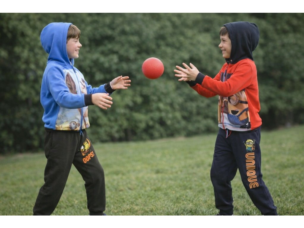Tepláková souprava Mimoni je určena pro chladnější dny, má uvnitř česaný jemný hřejivý chloupek. Materiálově je velmi příjemná a pohodlná, mikina má celolátkový velkoplošný motiv, zapínání na zip, nezbytné kapsy a kapucu. Tepláky mají v pase velmi pohodlnou gumu a také mají kapsy.
