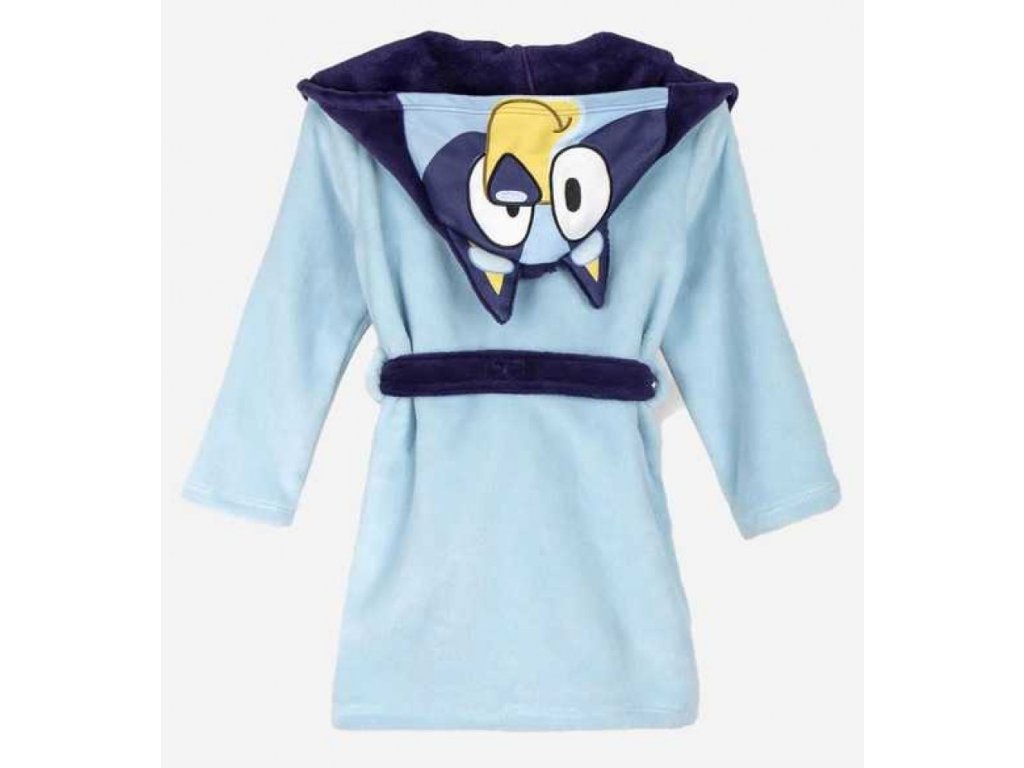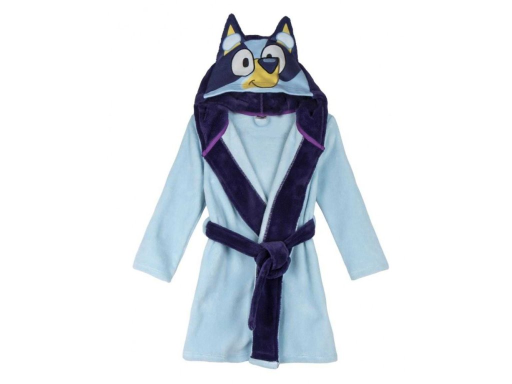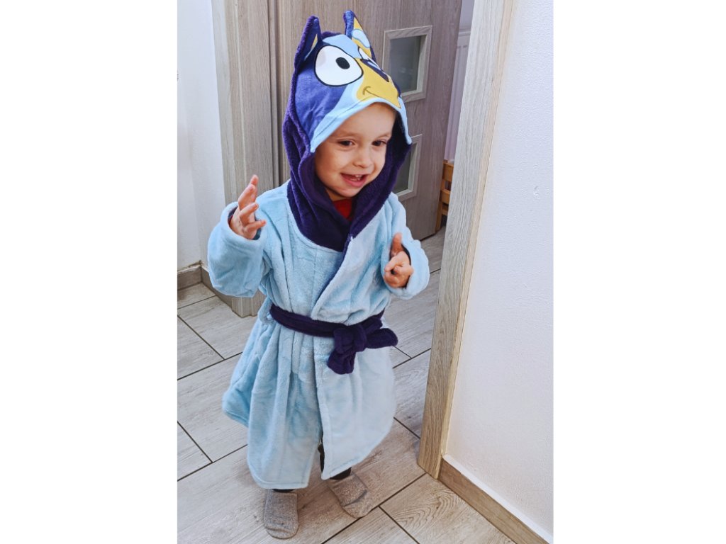 Když župan, tak pořádný a s kapucou s 3D oušky. A zrovna takový zde máme! Huňatý chlupáček má kapucu, která zobrazuje obličej a čumák Bluey a zdobí ji 3D stojící ouška. Materiál je velmi příjemný heboučký coral fleece a samozřejmě nechybí ani pásek. Krásná světle modrá barvička je vhodná pro kluky i holčičky.