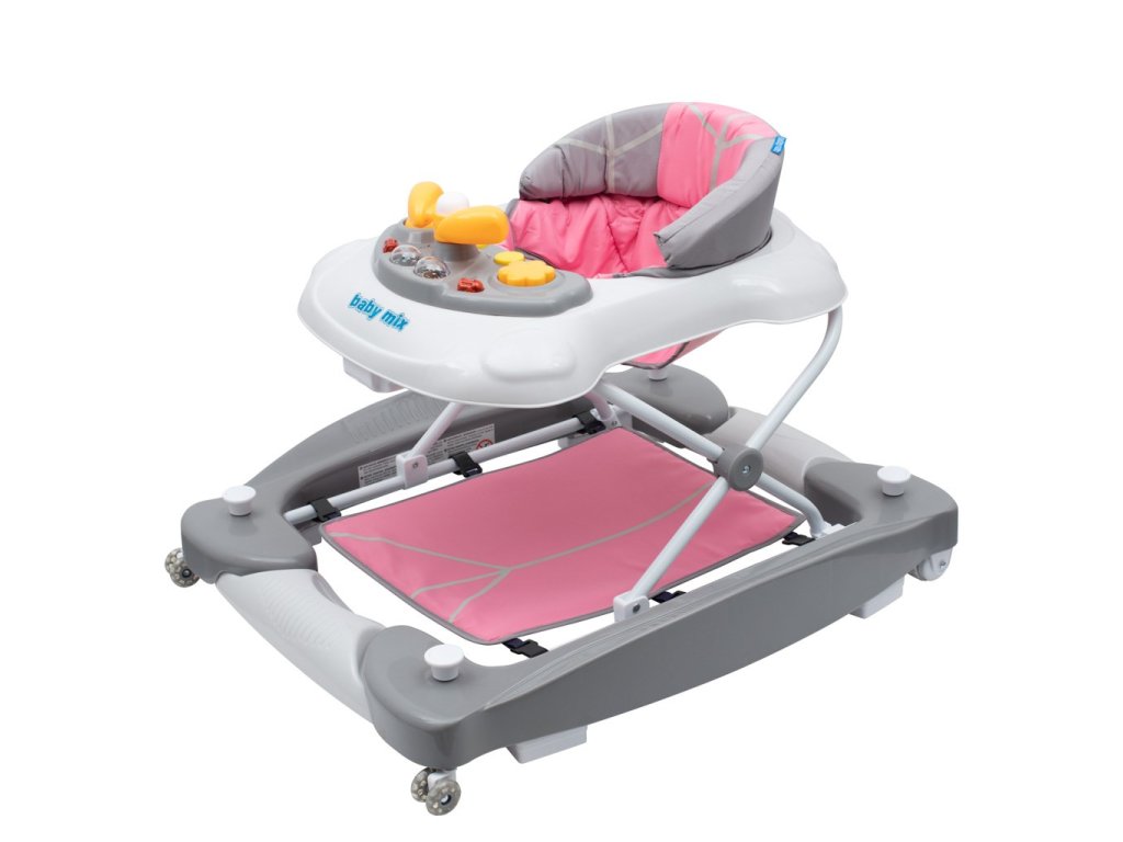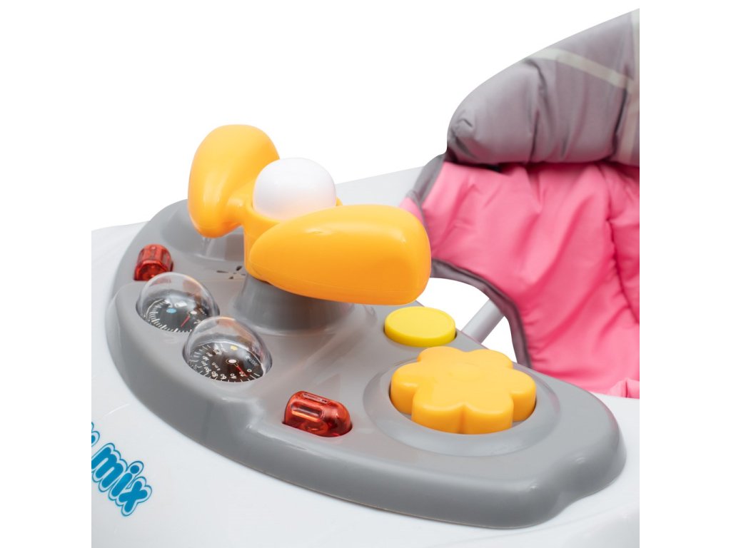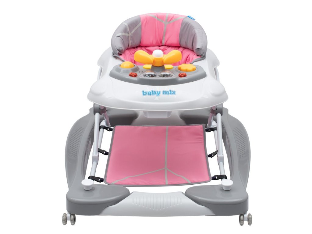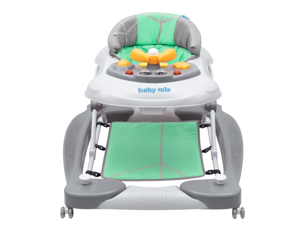 Dětské chodítko s houpačkou Baby Mix ve veselých barvách se čtyřmi silikonovými kolečky. Chodítko je nastavitelné do několika poloh a má velice pohodlný potah, který lze vyprat a je v zadní části vyztužený. Hrací pultík je vybaven volantem, který píská a lze ním otáčet, květinka, hrkálka, dvě tlačítka, které hrají melodie a dvě světýlka.