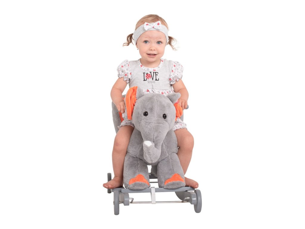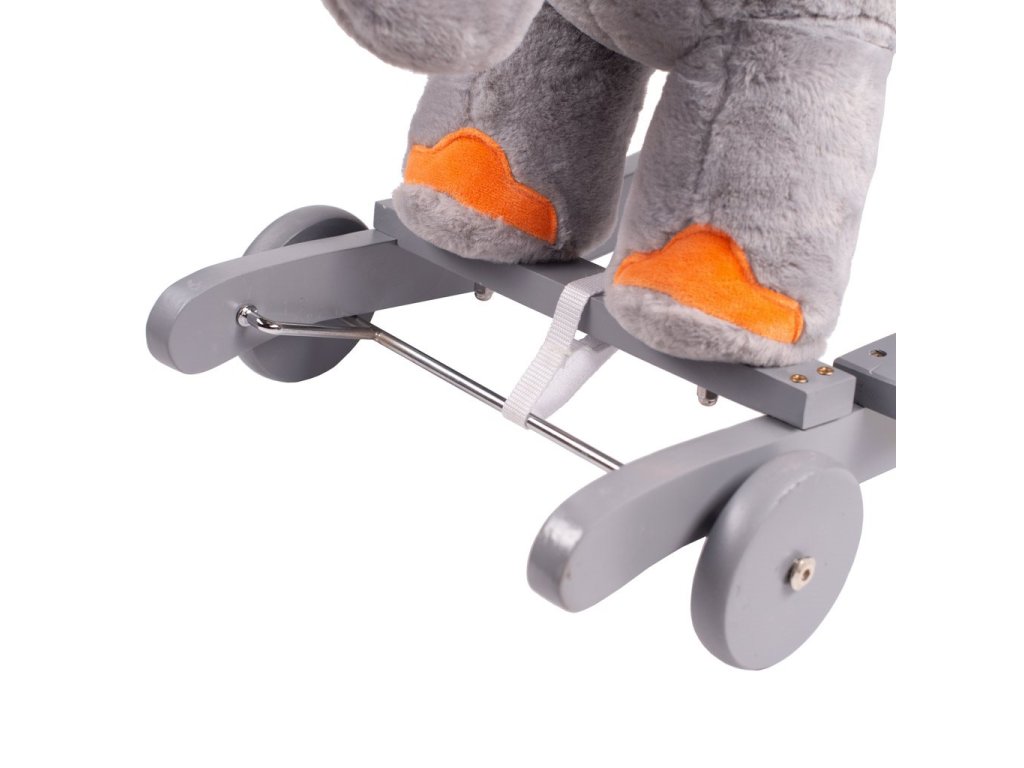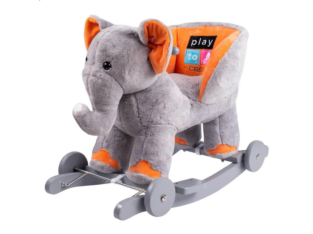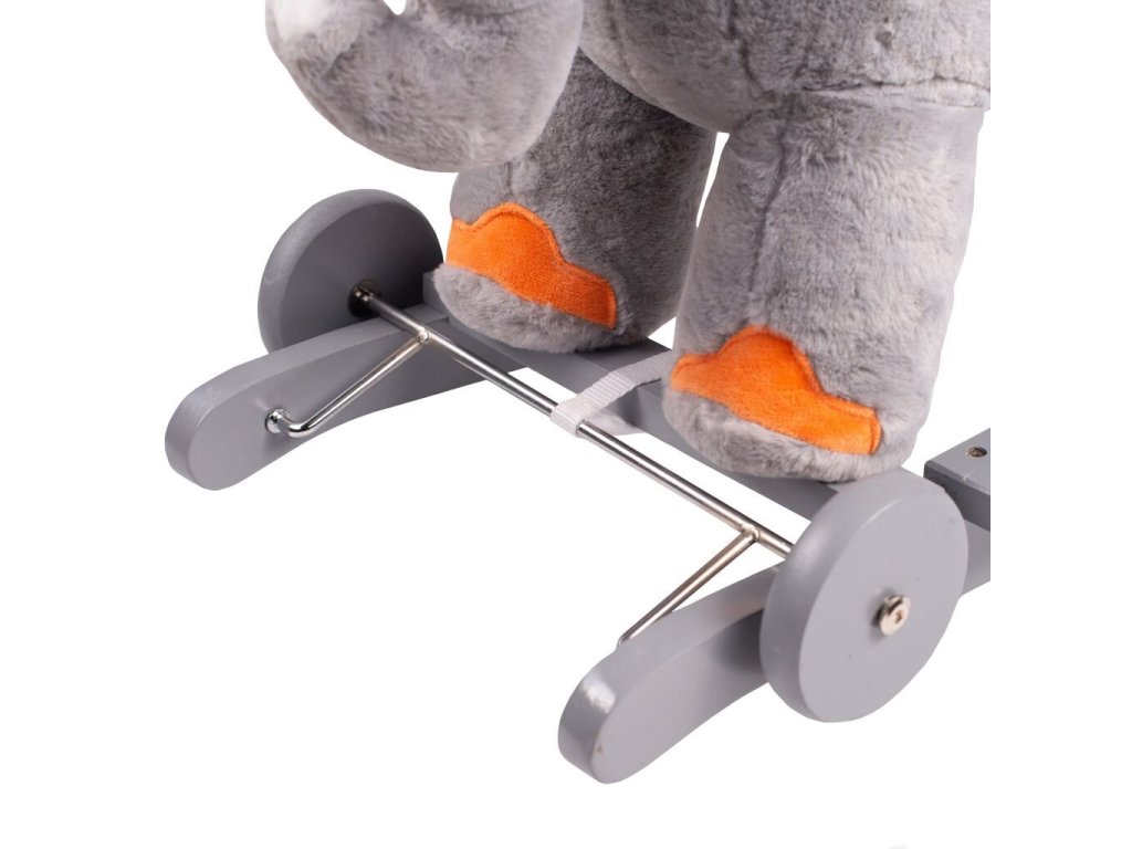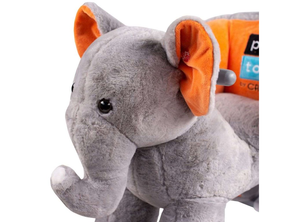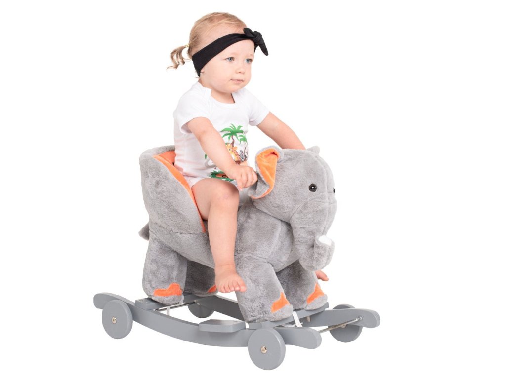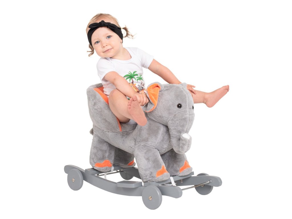 Neobyčejně krásný houpací sloník s kolečky PlayTo byl navržen pro děti, které mají rády dobrodružství. Pevné dřevěné lišty a rukojeti pomáhají dítěti udržet rovnováhu. Houpací lišty lze navíc jednoduše odšroubovat. Překlopením jednoduchého mechanismu na lištách vysunete kolečka, čímž ve vteřině změníte houpací hračku v jezdícího sloníka. Celá hračka je vyrobena z hebkého a velmi příjemného na dotyk plyšového materiálu. Po stisknutí ouška sloník zazpívá veselou písničku. Baterie jsou již součástí sloníka.