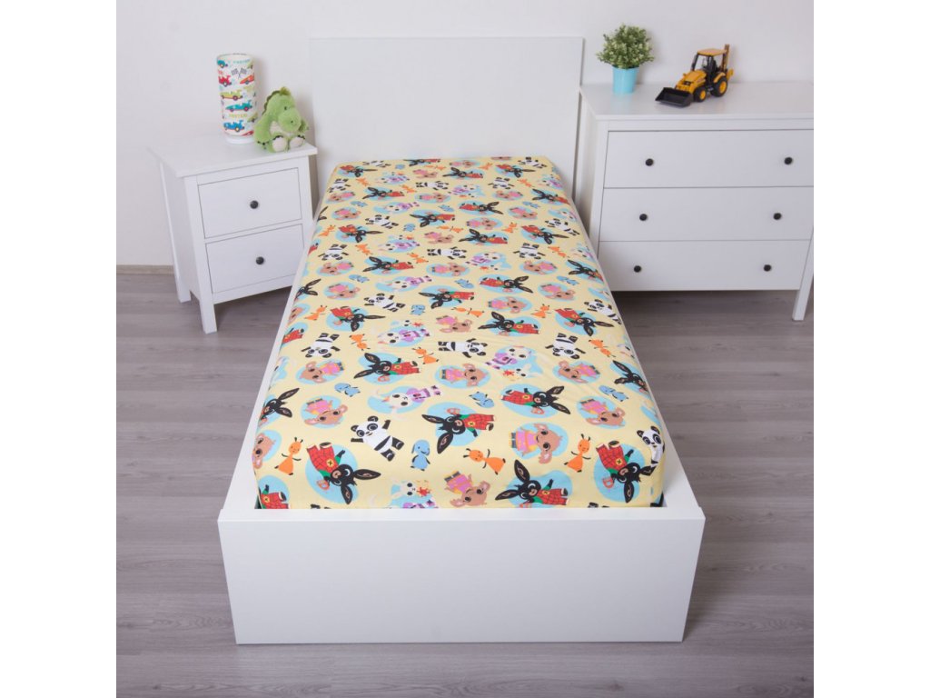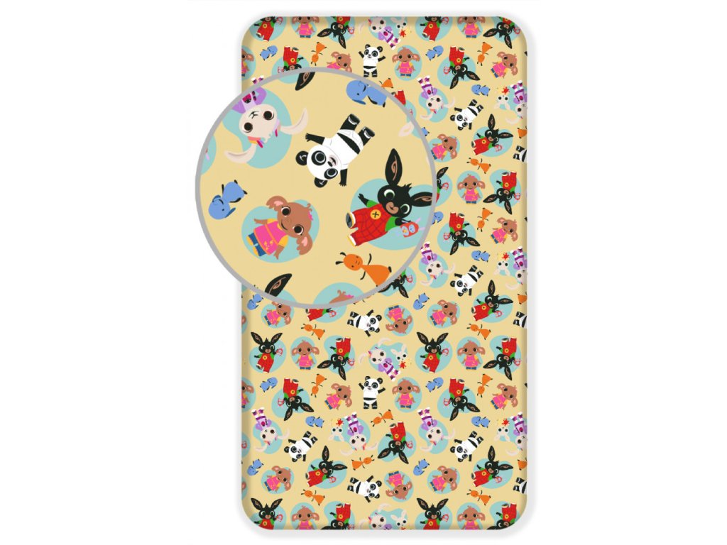 Dětské prostěradlo s motivem oblíbené pohádky Zajíček Bing 🐰 potěší všechny malé děti. Na veselém podkladu najdete postavičky jako Bing, jeho kamarádka Sula, Pando a další zvířecí kamarády, kteří dodají pokojíčku hravou a barevnou atmosféru 🎈.
