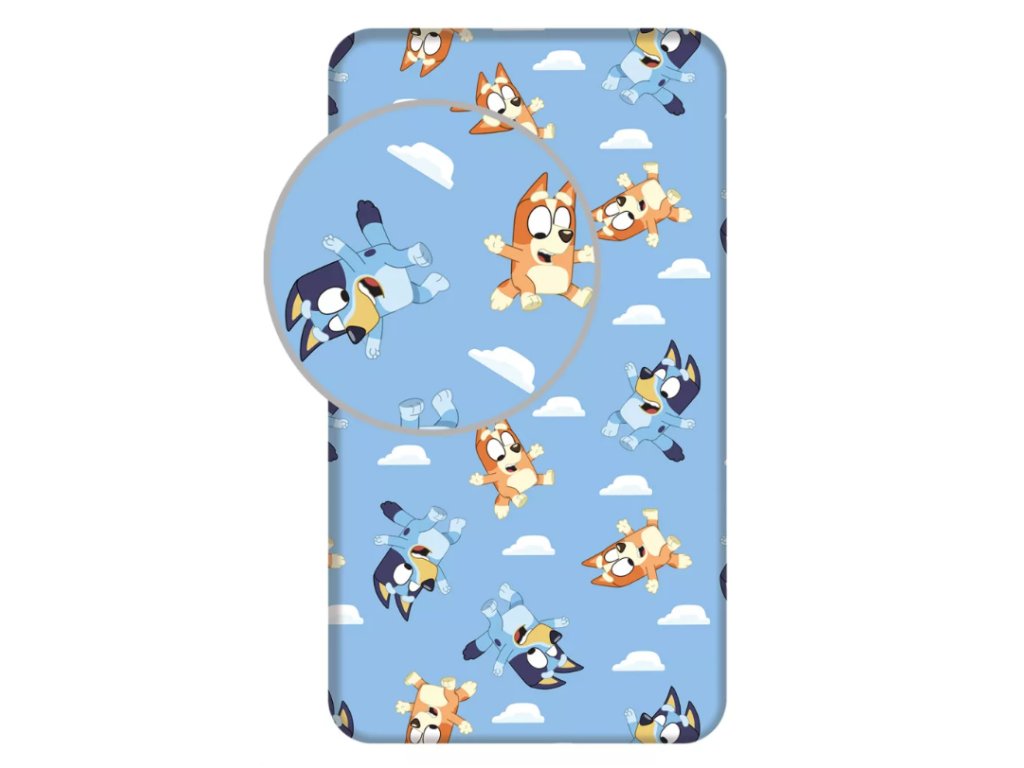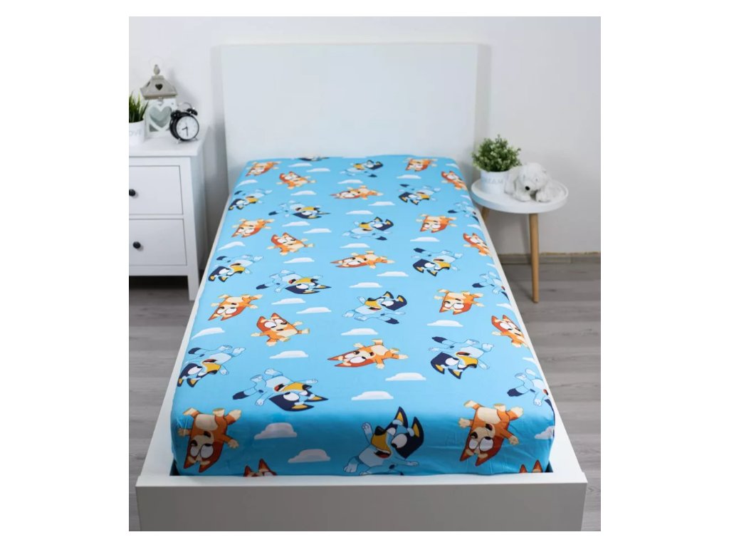Dopřejte svým dětem kvalitní a klidný spánek s bavlněným prostěradlem Bluey, které potěší všechny malé příznivce animovaného hrdiny. Veselý motiv na světle modrém podkladu rozzáří každý dětský pokoj a je vhodný pro kluky i holčičky.