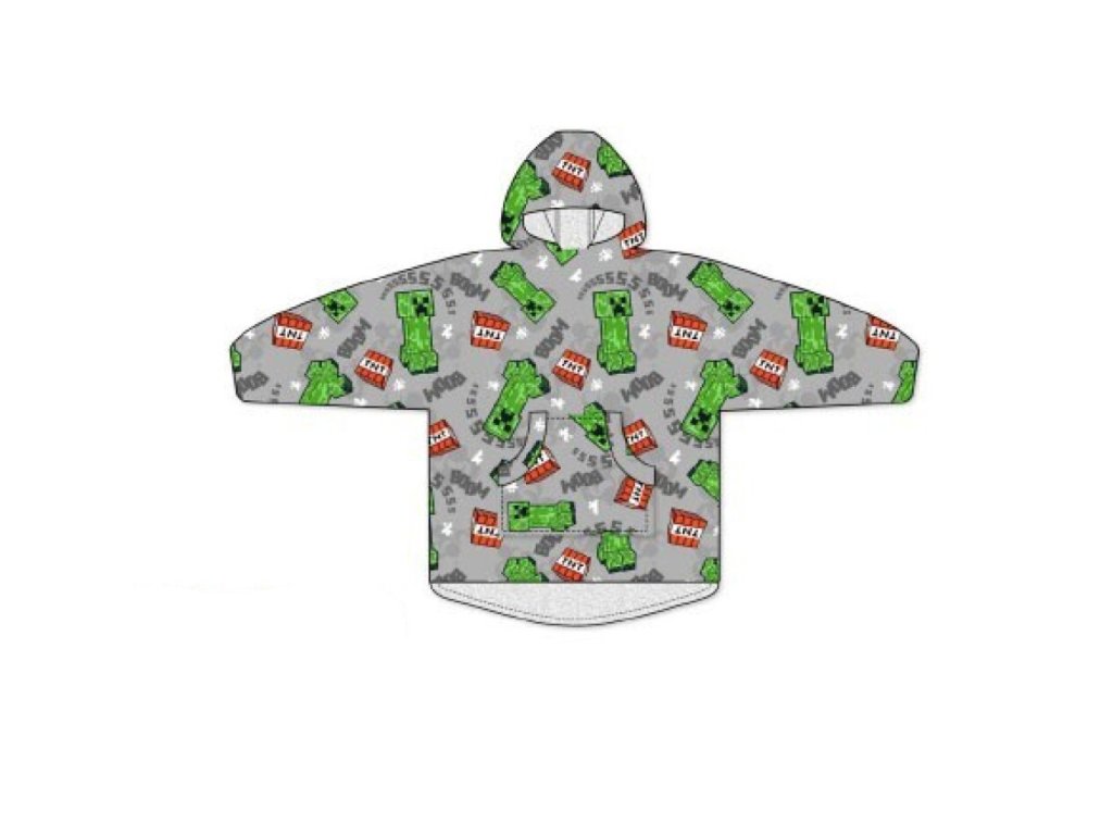 Hřejivé Minecraft pončo – fleecová deka pro dospělé je ideální volbou pro všechny fanoušky oblíbené hry. Stylový design s motivy Creeperů, TNT a pixelovými prvky na šedém podkladu zaujme a skvěle doplní domácí pohodlí. Díky praktickému střihu s kapucí a kapsou můžete deku jednoduše nosit přes běžné oblečení nebo pyžamo.