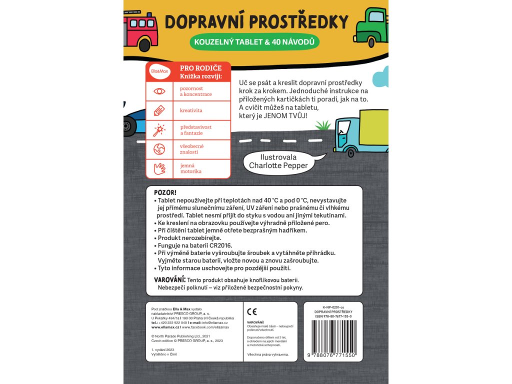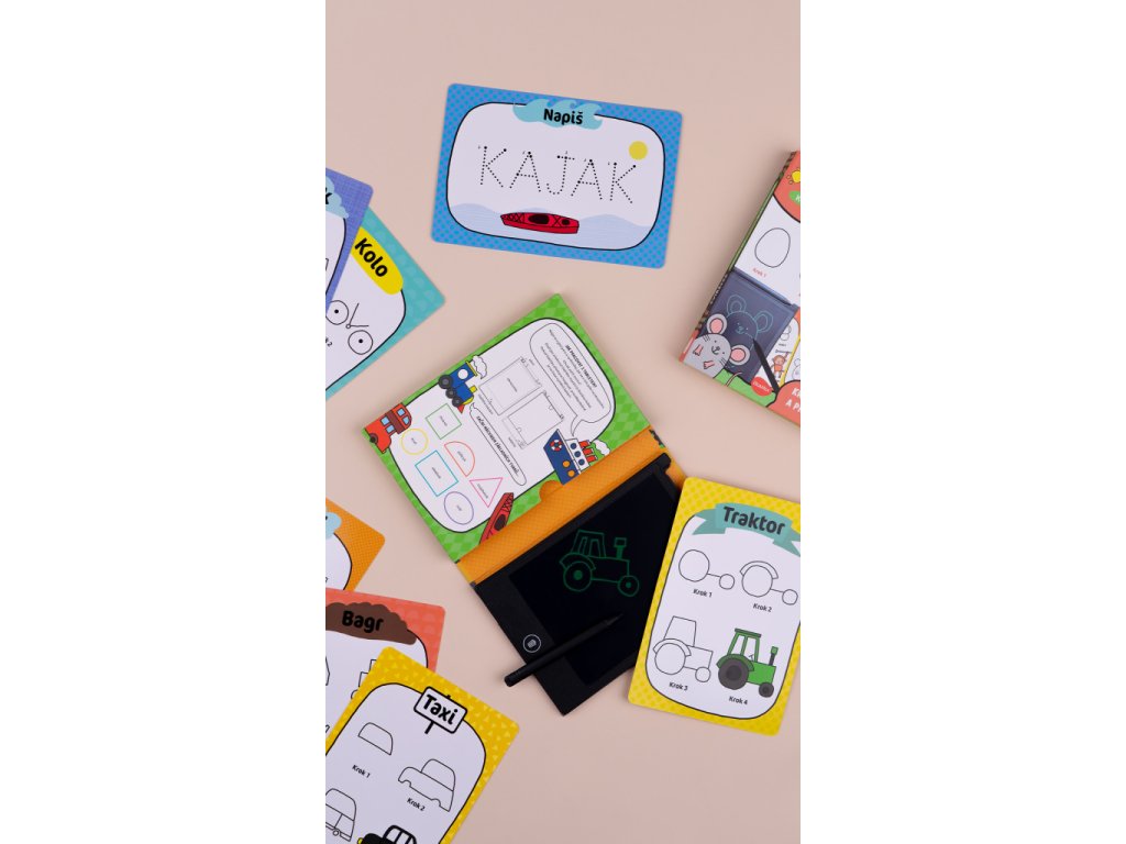 Učte se psát a kreslit dopravní prostředky krok za krokem. Jednoduché instrukce na přiložených kartičkách poradí vašim nejmenším jak na to. A cvičit mohou na tabletu, který je JENOM JEJICH! Chcete začít znovu? Žádný problém – stačí stisknout tlačítko mazání! Práce s výukovými kartičkami a tabletem rozvíjí pozornost a koncentraci, jemnou motoriku, ale také kreativitu, představivost, fantazii a v neposlední řadě všeobecné znalosti!Součástí ceny je recyklační příspěvek ve výši 1,26 Kč s DPH.