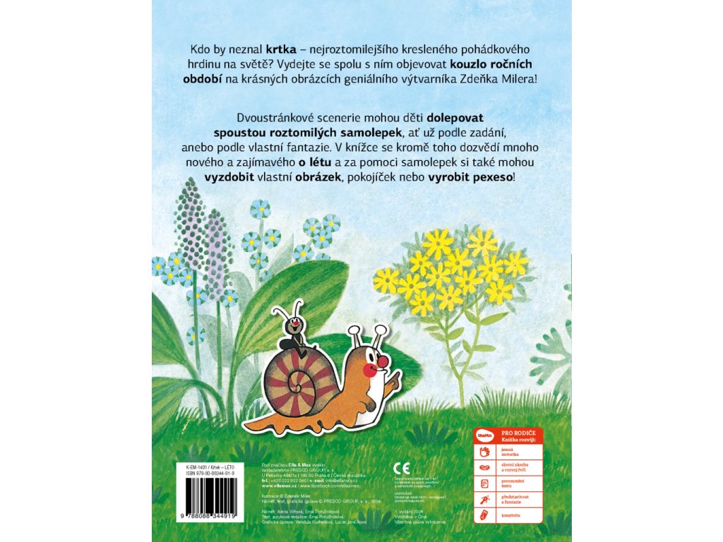Kdo by neznal krtka – nejroztomilejšího kresleného pohádkového hrdinu na světě? Vydejte se spolu s ním objevovat kouzlo ročních období na krásných obrázcích geniálního výtvarníka Zdeňka Milera! Dvoustránkové scenerie mohou děti dolepovat spoustou roztomilých samolepek, ať už podle zadání, anebo podle vlastní fantazie. V knížce se kromě toho dozvědí mnoho nového a zajímavého o létě a za pomoci samolepek si také mohou vyzdobit vlastní obrázek, pokojíček nebo vyrobit pexeso!Doplňkové parametry