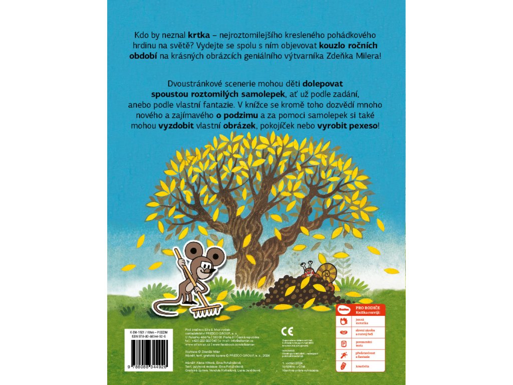 Kdo by neznal krtka – nejroztomilejšího kresleného pohádkového hrdinu na světě? Vydejte se spolu s ním objevovat kouzlo ročních období na krásných obrázcích geniálního výtvarníka Zdeňka Milera! Dvoustránkové scenerie mohou děti dolepovat spoustou roztomilých samolepek, ať už podle zadání, anebo podle vlastní fantazie. V knížce se kromě toho dozvědí mnoho nového a zajímavého o podzimu a za pomoci samolepek si také mohou vyzdobit vlastní obrázek, pokojíček nebo vyrobit pexeso!Doplňkové parametry