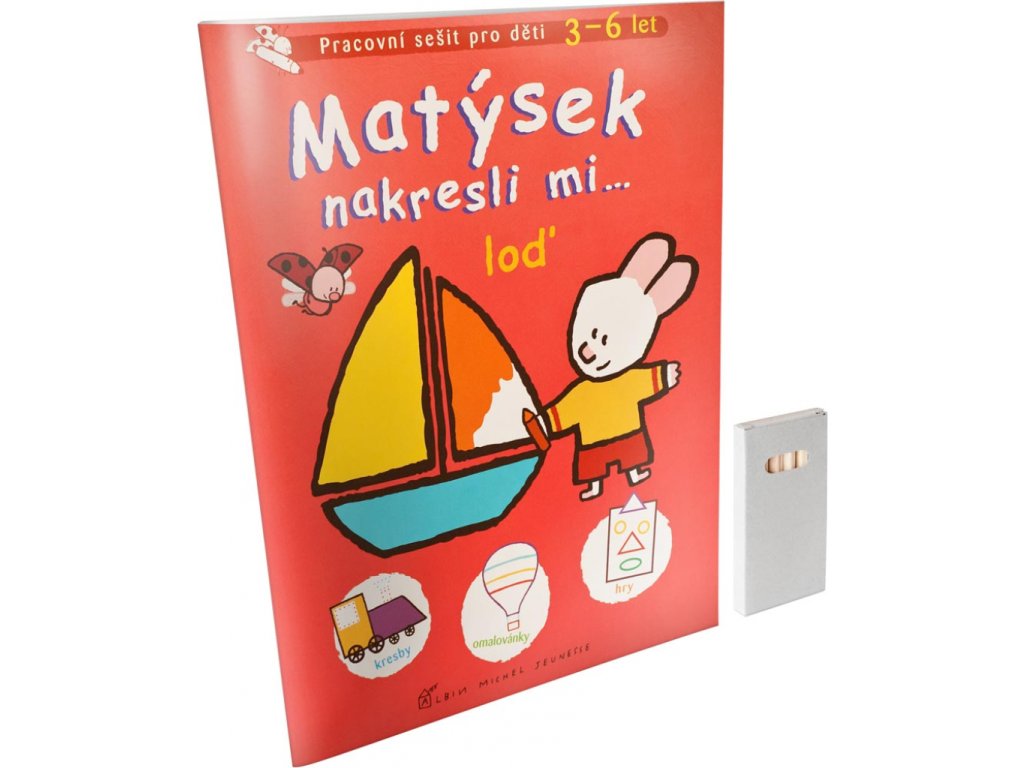 Pracovní sešit Matýsek – nakresli mi… loď je určený dětem ve věku od 3 do 6 let. Obsahuje spoustu zábavných úkolů, jako například vybarvit obrázek, spojit tečky, dokreslit chybějící části obrázku nebo hledat rozdíly mezi dvěma obrázky. Stránkami pracovního sešitu děti provází oblíbená postavička Matýsek a jeho kamarádka beruška Jája. S nimi se naučí kreslit nejen loď, ale taky vlak nebo létající balon, a dále poznávat geometrické tvary. Součástí pracovního sešitu jsou pastelky!Doplňkové parametry