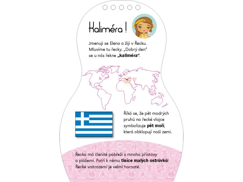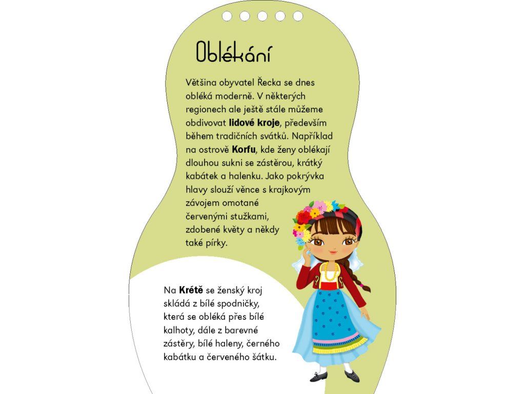 Další titul oblíbené série, která našla své obdivovatele v desítkách zemí světa, představuje malým čtenářům kouzlo Řecka prostřednictvím panenky Eleny. Kreativní omalovánky, spousta samolepek… knížka obsahuje vše, co je třeba k vytvoření nesčetných modelů podle řecké módy. A k tomu se děti dočtou i spoustu zajímavých informací navrch! Jak se jejich vrstevníci v Řecku zdraví, jak se tam učí, na jakých specialitách si pochutnávají? Víte, co jsou tzatziky nebo co je sirtaki? To a ještě mnohem víc se dozvíte, vydáte-li se za poznáním s našimi panenkami. A ke každé knížce dostanete krásný náramek pro štěstí!Doplňkové parametry