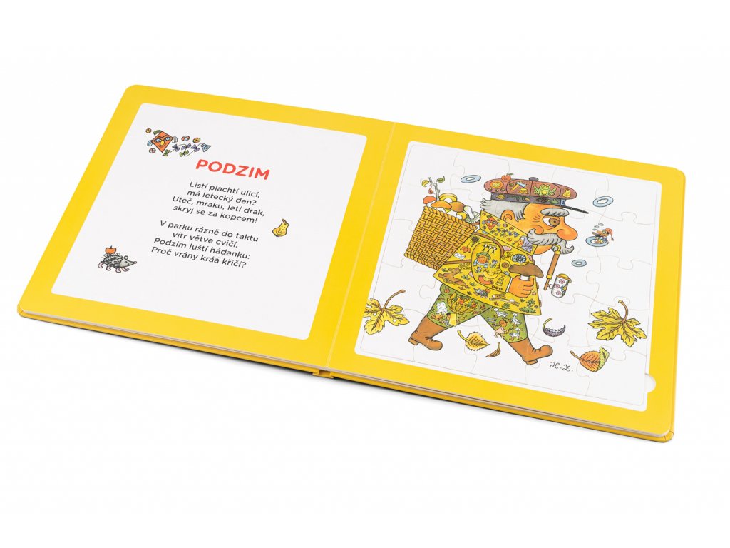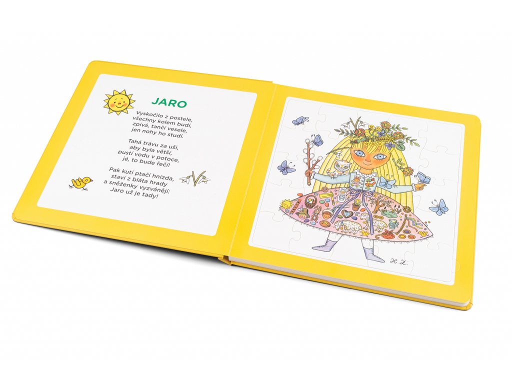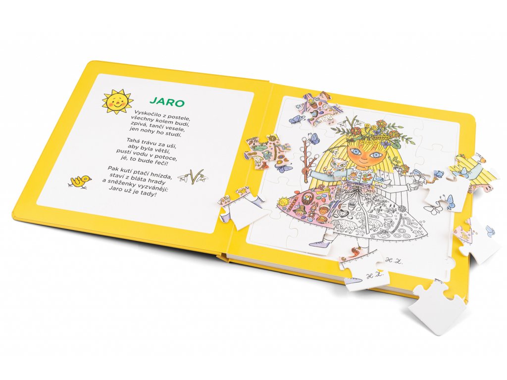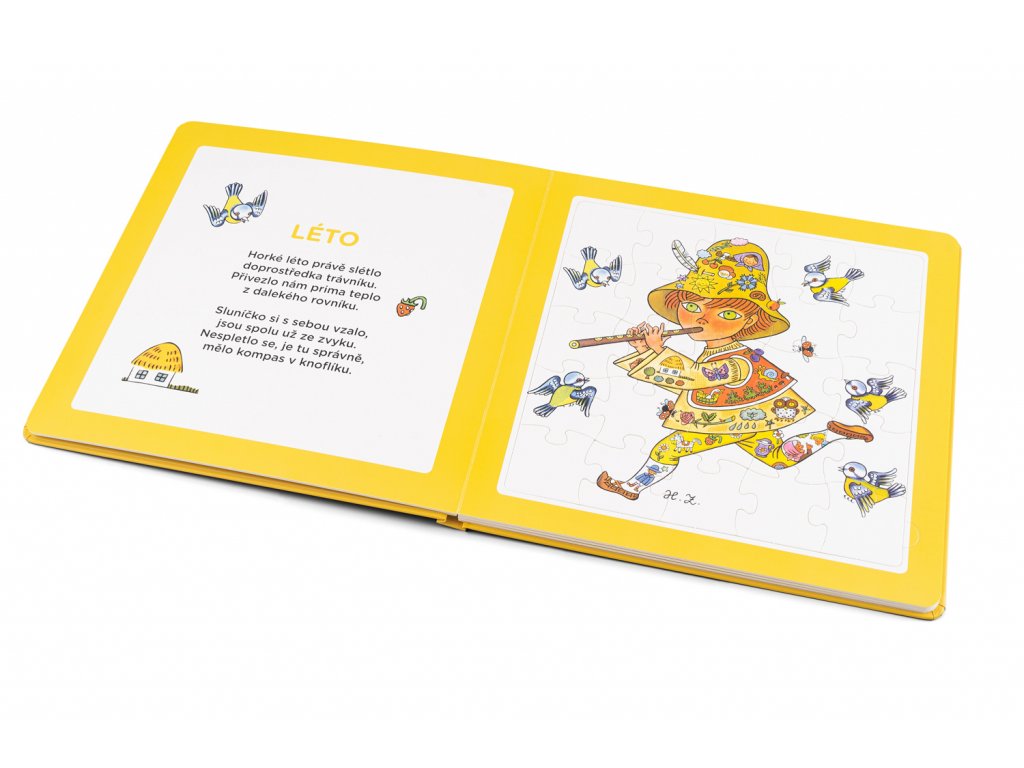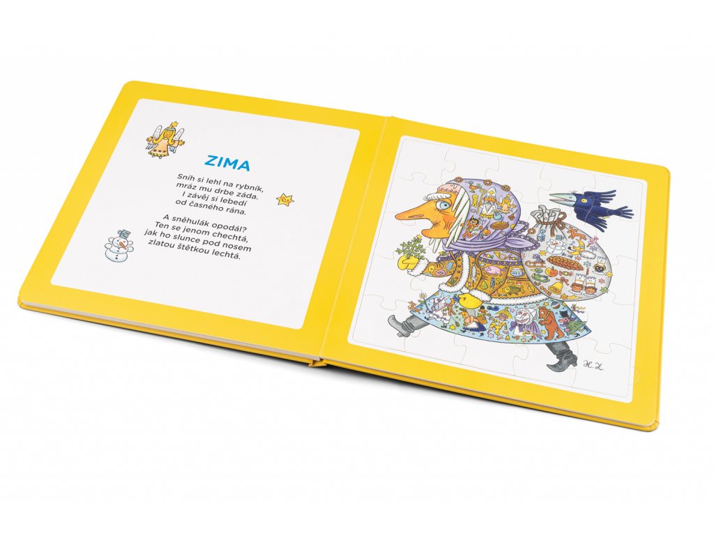V půvabné knížce s kouzelnými ilustracemi renomované autorky Heleny Zmatlíkové, tolik oblíbenými již hezkou řádkou generací, poznají děti jaro, léto, podzim a zimu. Věděli jste, že jaro je děvčátko s věnečkem z kvítí a sukní plnou mláďátek, léto pasáček, jehož šaty voní prázdninami, podzim dědeček s dýmkou nesoucí poslední plody sadů a lesů a zima ledová babička s rancem vnášející radost a barvy do dlouhých zimních večerů? Obrázky pro nejmenší doprovázejí veselé říkanky Aleny Zímové, zkušené autorky několika knih básniček pro děti.Pod barevnými puzzle skládankami objeví děti černobílé obrázky, které jim poslouží jako nápověda při skládání, ale mohou si je také samy vybarvit. A na posledních stránkách čekají malé čtenáře jednoduché kvízové otázky!