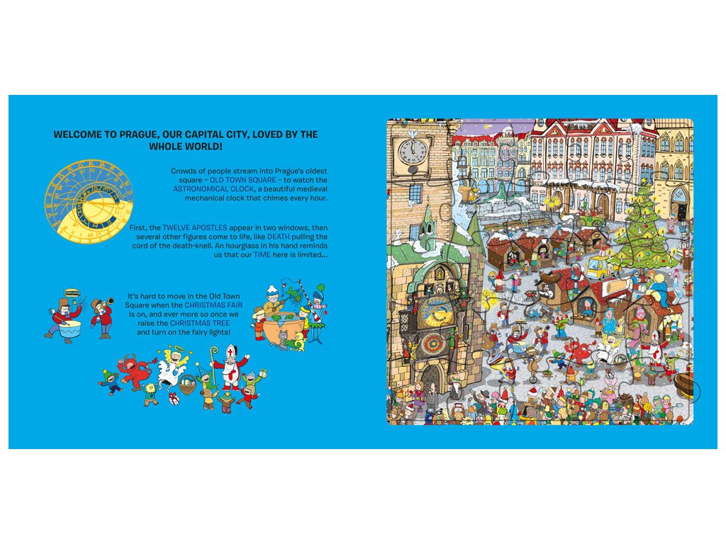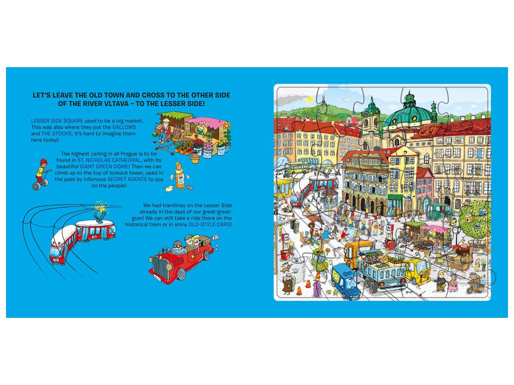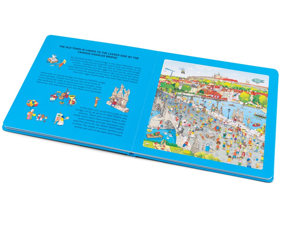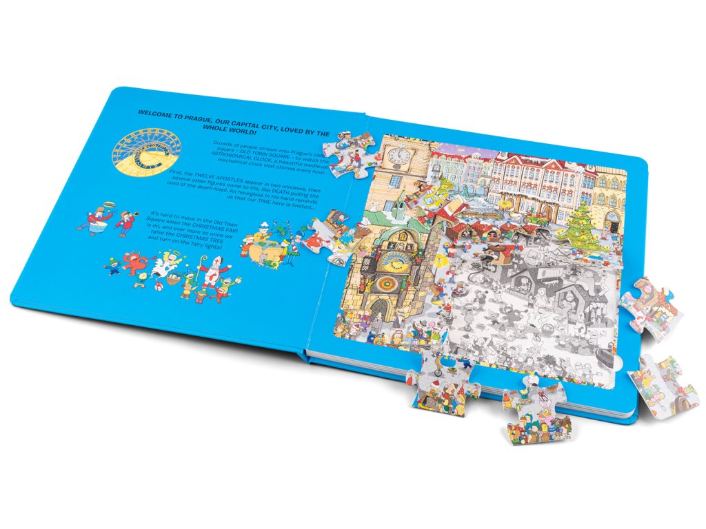 Tato knížka představuje nejkrásnější místa a zákoutí našeho hlavního města – stověžaté Prahy. Navštívíte zde Karlův most a pokocháte se výhledem na Pražský hrad. Zavítáte na Malostranské náměstí s majestátním chrámem svatého Mikuláše a samozřejmě na nejstarší náměstí Prahy – Staroměstské náměstí se světoznámým a turisty obdivovaným orlojem. Prohlídku města jistě rádi zakončíte oddychem ve Stromovce – největší z pražských zahrad. Na cestě za poznáním vás doprovodí řada komických postaviček i pražských přízraků.Pod barevnými puzzle skládankami objeví děti černobílé obrázky, které jim poslouží jako nápověda při skládání, ale mohou si je také samy vybarvit. A na posledních stránkách čekají malé čtenáře jednoduché kvízové otázky!