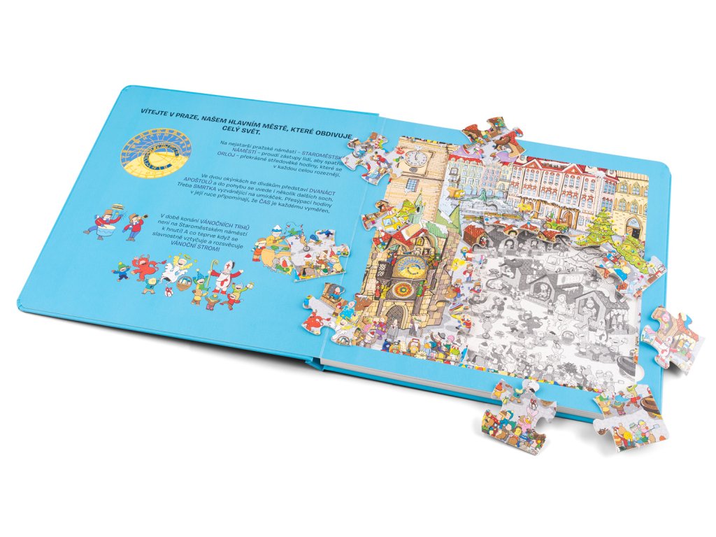 Tato knížka představuje nejkrásnější místa a zákoutí našeho hlavního města – stověžaté Prahy. Navštívíte zde Karlův most a pokocháte se výhledem na Pražský hrad. Zavítáte na Malostranské náměstí s majestátním chrámem svatého Mikuláše a samozřejmě na nejstarší náměstí Prahy – Staroměstské náměstí se světoznámým a turisty obdivovaným orlojem. Prohlídku města jistě rádi zakončíte oddychem ve Stromovce – největší z pražských zahrad. Na cestě za poznáním vás doprovodí řada komických postaviček i pražských přízraků.Pod barevnými puzzle skládankami objeví děti černobílé obrázky, které jim poslouží jako nápověda při skládání, ale mohou si je také samy vybarvit. A na posledních stránkách čekají malé čtenáře jednoduché kvízové otázky!