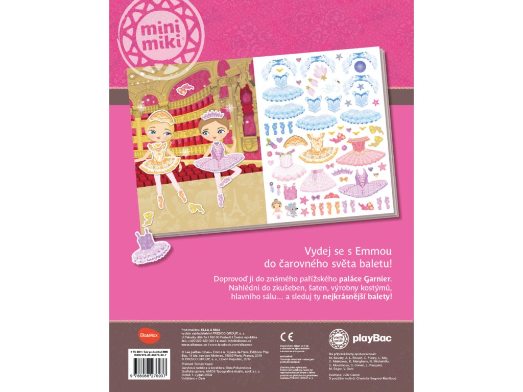Knížky z kolekce minimiky patří dlouhodobě k našim nejprodávanějším. Představují tím úplně nejjednodušším a zároveň hravým způsobem módu a něco z kultury cizích zemí. Tato novinka se ze zavedené série trochu vymyká. S oblíbenou francouzskou panenkou Emmou v ní totiž zavítáme do pařížského baletu, světa pohádkových dekorací a kostýmů. Zejména holčičky jistě ocení atraktivní tematickou kolekci šatů pro baletky na více než 300 samolepkách a v neposlední řadě i dvojjazyčné texty v obrázcích.Doplňkové parametry