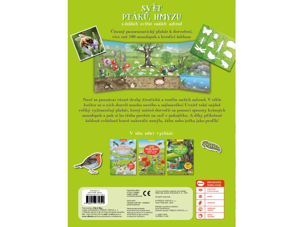 Naučte se poznávat různé druhy živočichů a rostlin, které jsou k vidění v našich zahradách. V téhle knížce se o nich dozvíte mnoho nového a zajímavého! Uvnitř také najdete veliký vyjímatelný plakát, který můžete dotvořit za pomoci spousty krásných samolepek a pak si ho třeba pověsit na zeď v pokojíčku. A díky přiložené šabloně zvládnete hravě nakreslit motýla, žábu nebo ježka jako profík!Doplňkové parametry