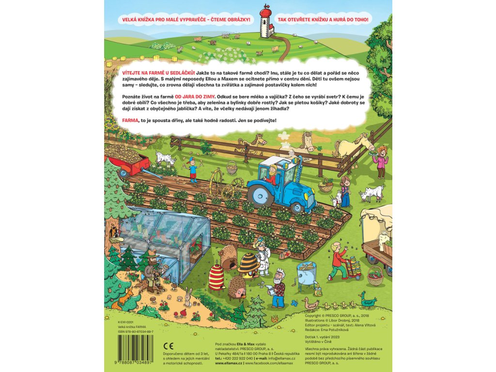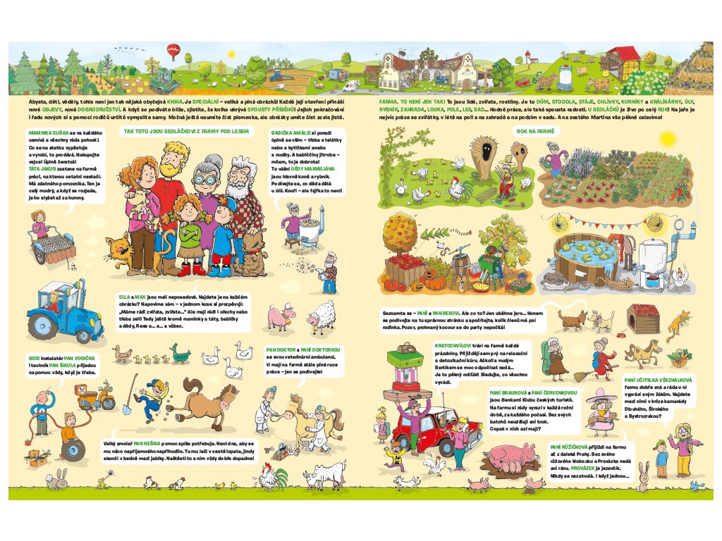 VÍTEJTE NA FARMĚ U SEDLÁČKŮ! Jakže to na takové farmě chodí? Inu, stále je tu co dělat a pořád se něco zajímavého děje. S malými neposedy Ellou a Maxem se ocitnete přímo v centru dění. Děti tu ovšem nejsou samy – sledujte, co zrovna dělají všechna ta zvířátka a zajímavé postavičky kolem nich!Poznáte život na farmě OD JARA DO ZIMY. Odkud se bere mléko a vajíčka? Z čeho se vyrábí svetr? K čemu je dobré obilí? Co všechno je třeba, aby zelenina a bylinky dobře rostly? Jak se pletou košíky? Jaké dobroty se dají získat z obyčejného jablíčka? A víte, že včelky nedávají jenom žihadla?