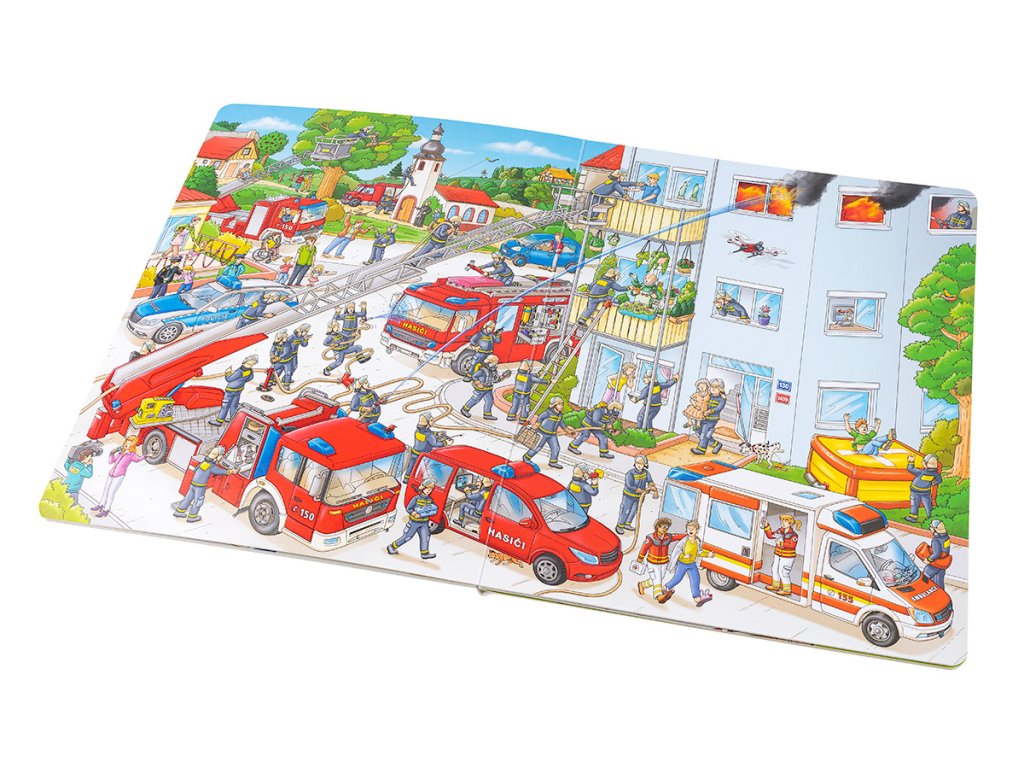 Rychle si navlékli výstroj, nasadili přilby a už se řítí se zapnutou houkačkou k hořícímu domu. Rychle připravit dlouhý hasičský žebřík a stříkačky a hasíme! Je třeba vyprostit z plamenů nešťastníky, kteří nestačili včas utéct před ohněm a zůstali uvězněni v domě. To je také práce hasičů: odvážně se vrhají do plamenů, aby před požárem zachránili všechno živé. Detailní ilustrace v další z řady velkých obrázkových knih seznámí malé čtenáře s rozmanitou prací hasiče i s každodenním životem na stanici. Stačí se jen ponořit do barevného světa obrázků a pozorně sledovat.Doplňkové parametry