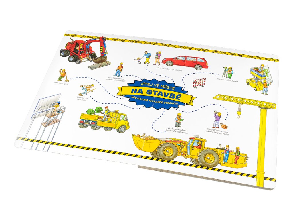 V centru města, na jeho okrajích, v parku, na řece – tam všude se kope, opravuje, rekonstruuje, zušlechťuje, staví… Náklaďáky, míchačky, bagry, jeřáby, vysokozdvižné vozíky a další zajímavé stroje pracují na plné obrátky a kolem nich panuje čilý ruch. Činí se tu pěkná řádka šikovných řemeslníků, jimž velí zkušený předák, a na všechno dohlíží stavbyvedoucí. Ruku k dílu přiloží i architekt, fotograf nebo třeba zahradník. A protože jsme ve městě, hemží se to tady i spoustou dalších postaviček. Všechny zažívají své vlastní mikropříběhy, o nichž si můžete donekonečna vyprávět. Některé z postav a strojů naleznete na každém obrázku v této knize – procvičte svou paměť a pozornost a stránku za stránkou „čtěte“ jejich dobrodružství v propracovaných ilustracích!Prostřednictvím půvabných obrázků se malí čtenáři naučí nejen nalézat slova, popisovat, vyprávět, ale také vnímat knihu jako zdroj informací, vědění i zábavy.