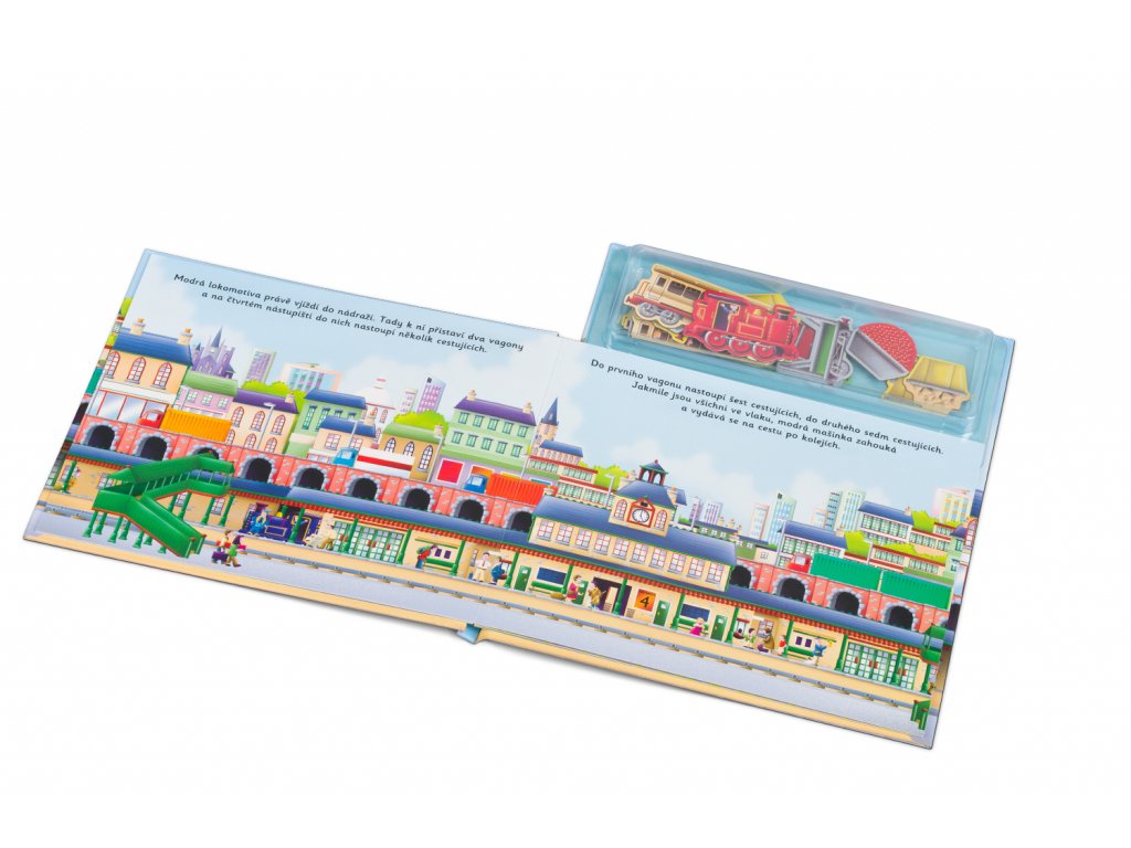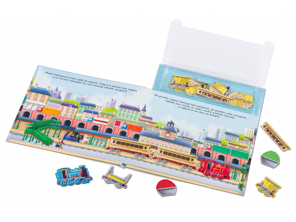 Húúú, húúú – pozor, přijíždí vlak! V přístavu, na vlakovém nádraží, na stavbě a po náročném dni v depu – tam všude najdeme lokomotivy a vagony pro osobní nebo nákladní přepravu. Tam všude nám vláčky pomáhají. Na každé stránce téhle knížky objeví děti kratičký příběh, který mohou spoluvytvářet pomocí magnetek. A až si do sytosti vyhrají, mohou všechny vozy zase „zaparkovat“ zpátky do úložného boxu, kde budou připraveny na další skvělou zábavu.Kniha obsahuje 21 ks magnetek.