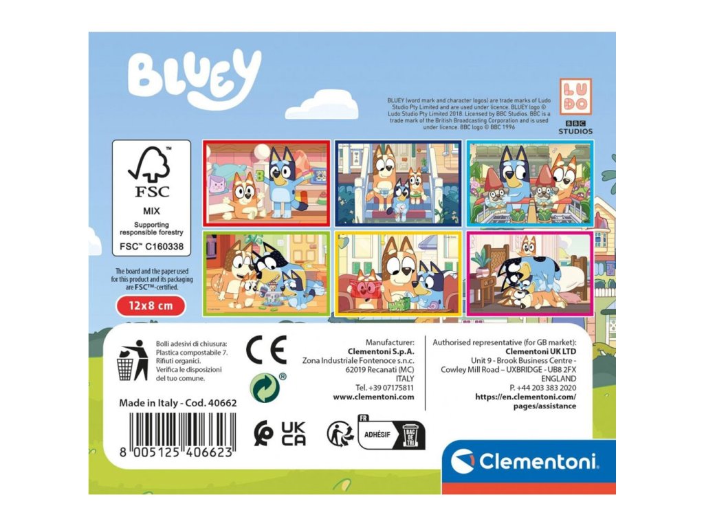 Dětské obrázkové kostky Bluey od Clementoni přinášejí jednoduchou a zábavnou hru pro nejmenší. Sada obsahuje 6 kostek, ze kterých lze složit 6 různých obrázků s oblíbenými postavičkami ze seriálu Bluey.