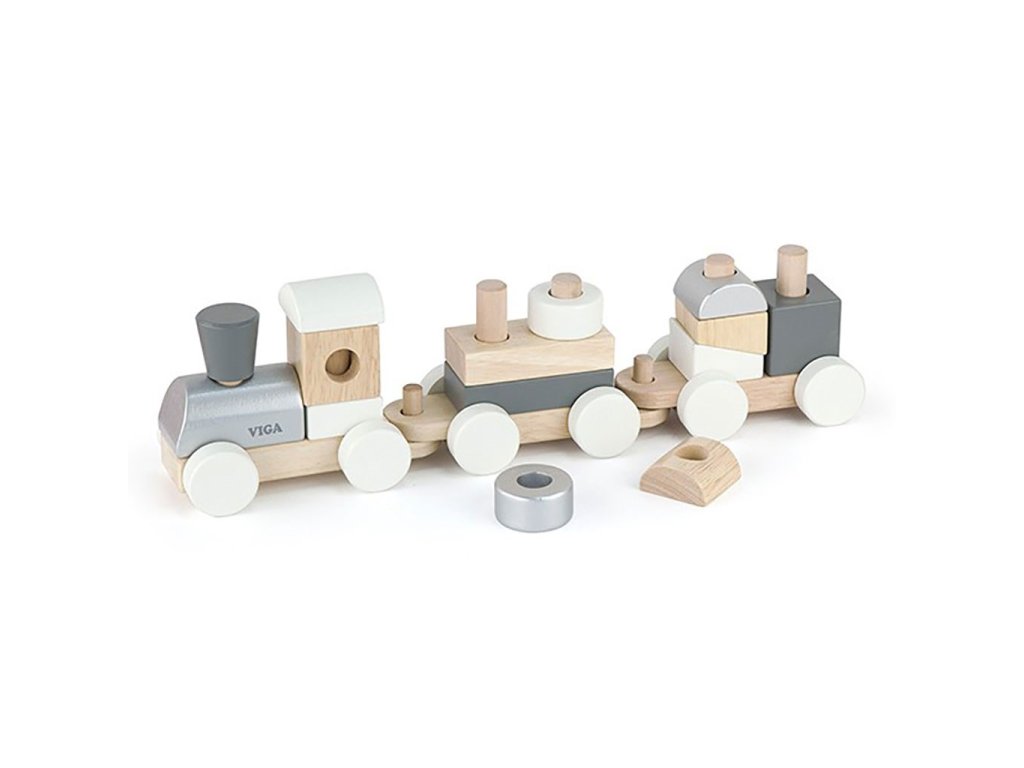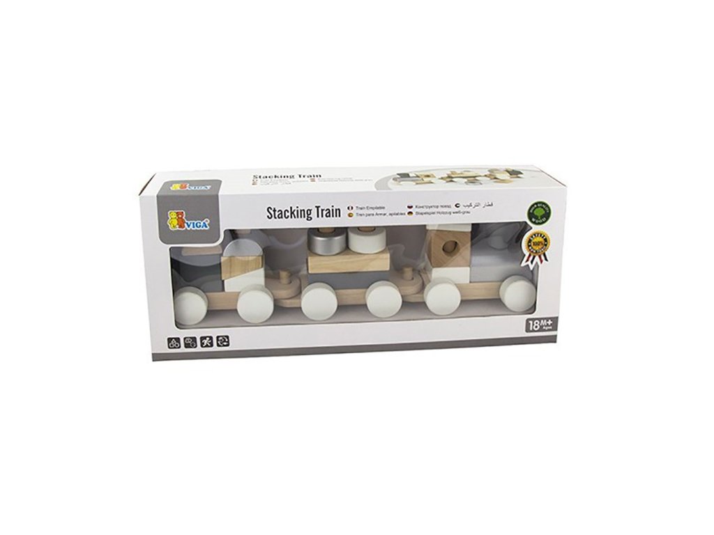 Šedobílý vláček s tahacími vagónky je určen pro aktivní batolata.Vláček rozvíjí koordinaci ruka-oko, podporuje logické myšlení a umožňuje kreativní hru.