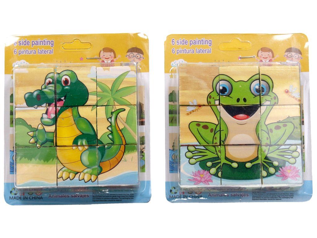 Malá skládačka, velká zábava. Dřevěné obrázkové kostky potěší děti, které rády objevují, skládají a zkouší nové kombinace. Každá strana kostek tvoří část obrázku, a jen správným otočením vznikne kompletní motiv. Na přiloženém balení můžeš vidět veselé zvířecí motivy, například krokodýla nebo žábu.