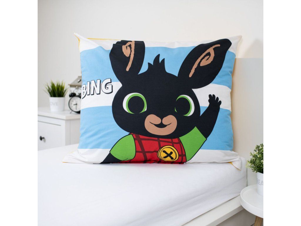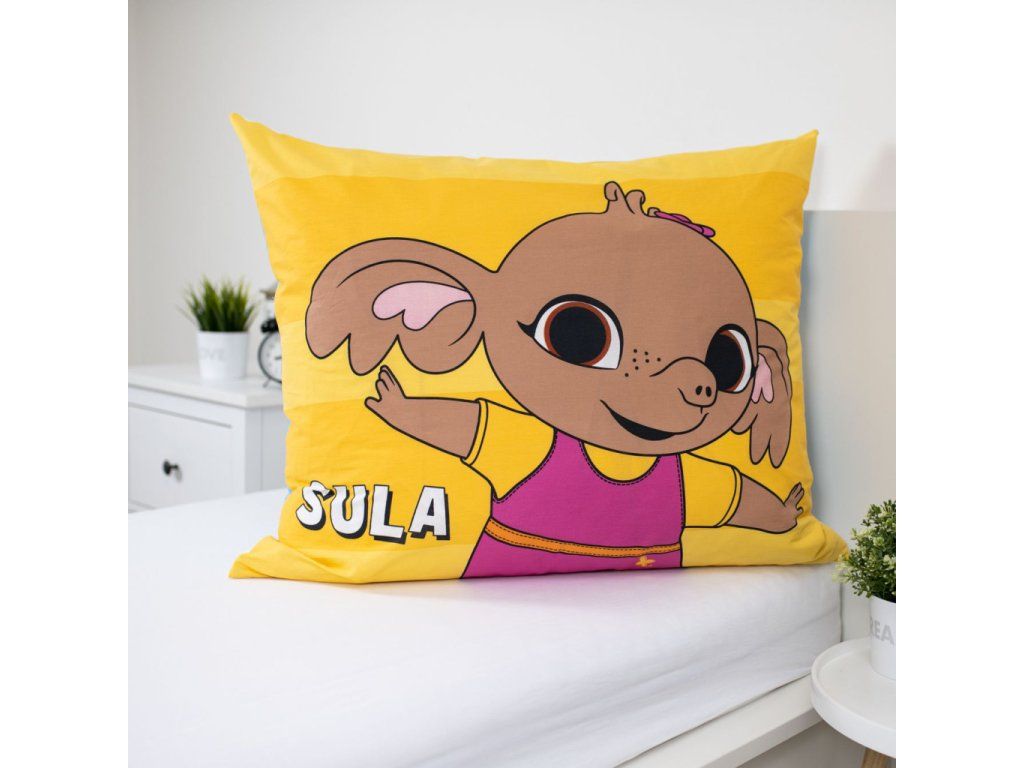 Rozměry 140×200 cm pro peřinu a 70×90 cm pro polštář odpovídají standardní velikosti ložní soupravy pro větší děti. Praktickým prvkem je oboustranný povlak na polštář – z jedné strany zdobí Bing, z druhé Sula, takže lze vzhled snadno měnit.