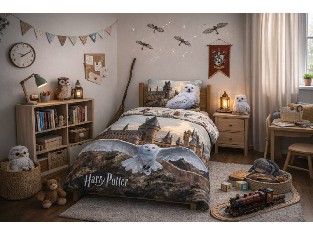 Vstupte s dětmi do kouzelného světa čar a dobrodružství s krásným povlečením inspirovaným Harry Potterem ✨. Motiv s Bradavickým hradem a sovou Hedvikou přenese malé fanoušky do magické atmosféry a zpříjemní každé usínání.