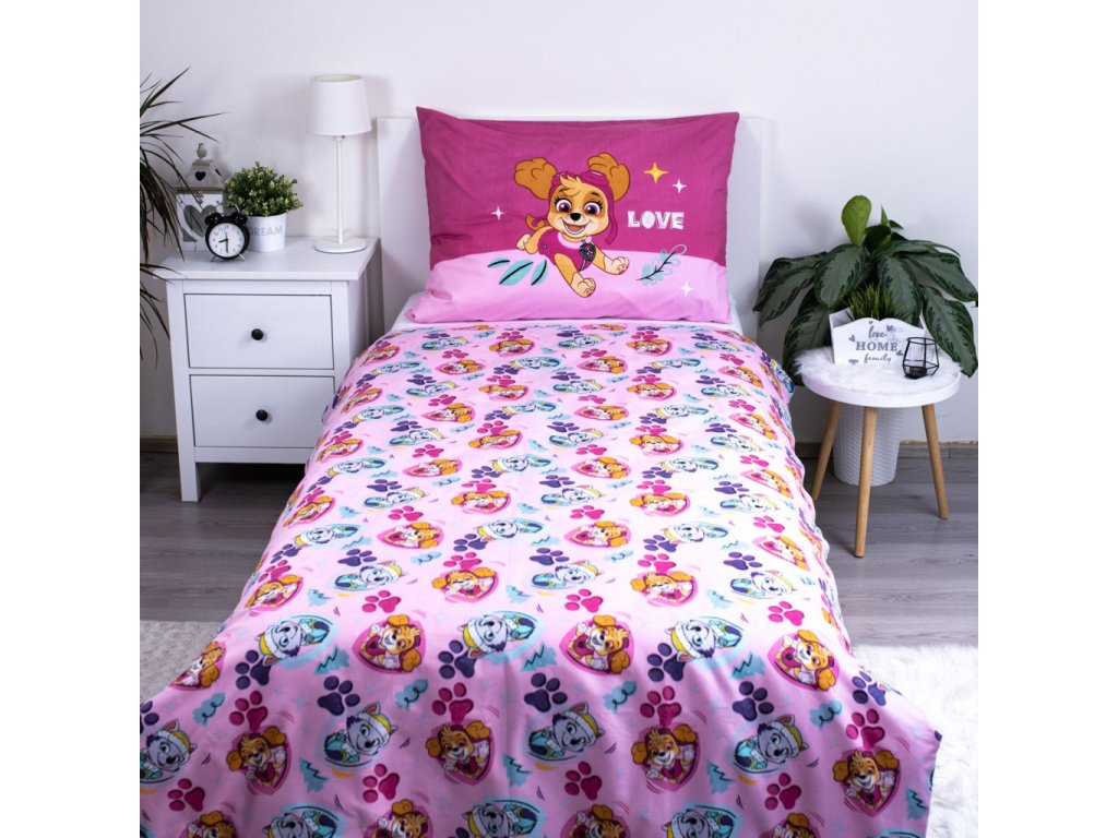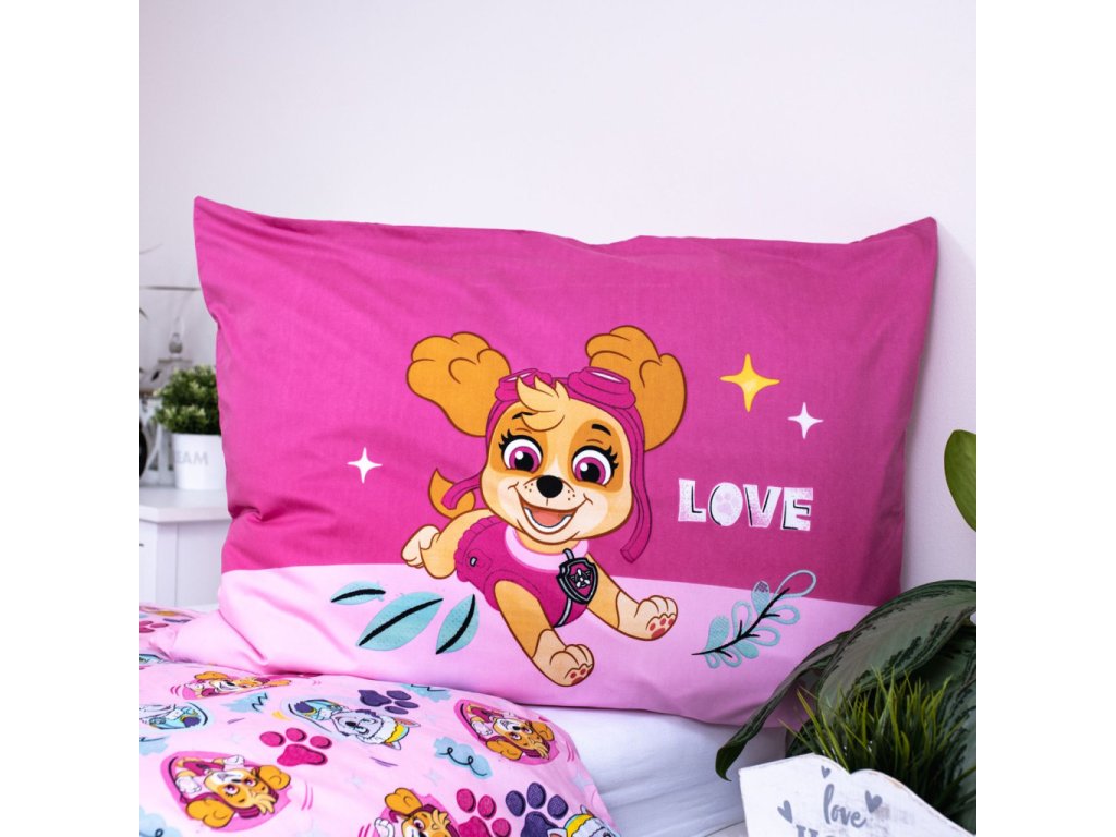 Povlečení Tlapková patrola přináší do dětského pokoje hravost, radost a pozitivní energii. Motiv oblíbených pejsků v růžovém ladění doplněný jemnými detaily a prvky inspirovanými dobrodružstvím vytváří útulné prostředí, které podporuje klidný spánek i příjemné usínání.