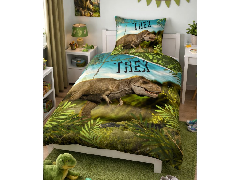 Dětské povlečení T-Rex v pralese, je vyrobeno ze 100% hladké bavlny a je oboustranné. Na lícní straně povlaku přikrývky je zobrazen největší ještěr a suchozemský predátor všech dob, Tyranosaurus Rex. Hledá kořist v hustém pralesním porostu. Reverzní strana povlečení je zelené barvy, s obrázky pozůstatků živočichů, které žily na přelomu prvohor a druhohor. Povlak polštáře je z obou stran stejný, vzorem i barvou shodný s lícní stranou povlaku přikrývky