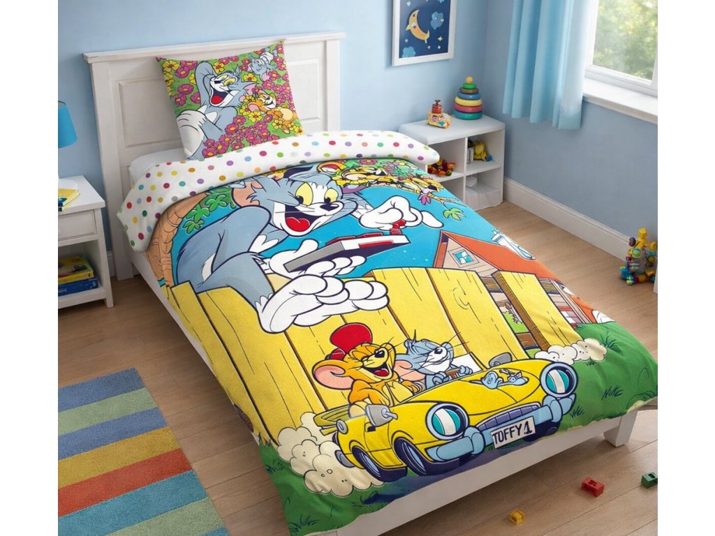 Bavlněné povlečení Tom a Jerry Ve žlutém kabrioletu, je oboustranné a je vyrobeno ze 100% hladké bavlny. Na lícní straně povlečení jsou Jerry a Tuffy v kabrňáckém, žlutém kabrioletu. Autíčko má pouze jednu chybu, a to tu, že je na dálkové ovládání, které třímá ve svých kočičích prackách Tom, nám všem známý uličník. Reverzní strana povlečení je bílá s malými různobarevnými puntíky. Povlak polštáře je z obou stran stejný, v tuto chvíli kamarádští Tom a Jerry, leží v záplavě květin