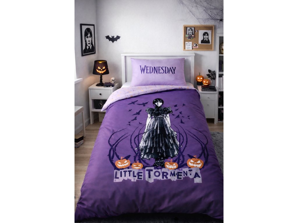 Originální dětské povlečení s motivem Wednesday vnese do dětského pokoje styl, tajemnou atmosféru a jedinečný design 🖤✨. Moderní fialové provedení s gotickými prvky, dýněmi a ikonickou postavou Wednesday potěší všechny děti i teenagery, kteří milují neobvyklý a trendy styl.