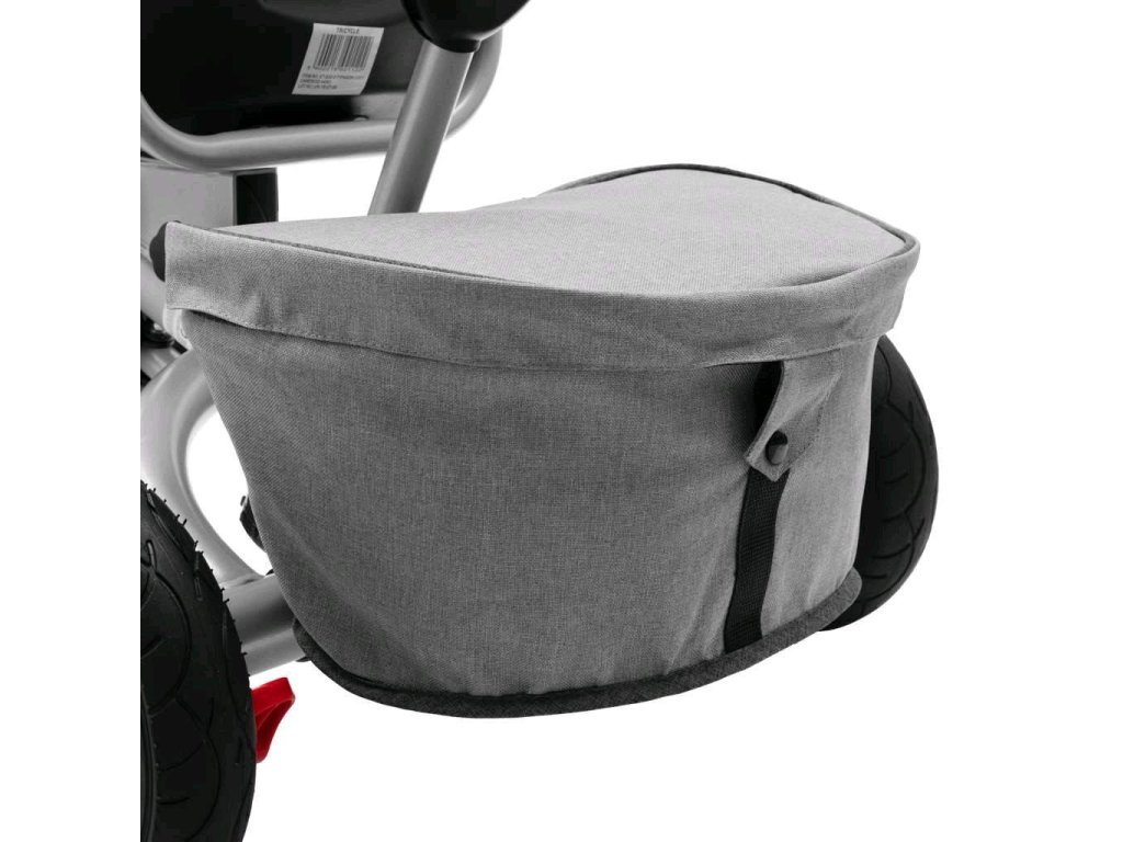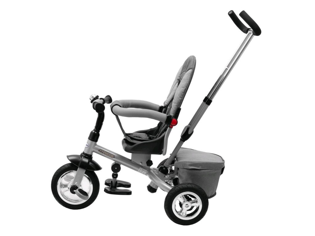 Dětská šlapací tříkolka Baby Mix TYPHOON je multifunkční dopravní prostředek a je typickým příkladem produktů GROW UP - roste zároveň s dítětem. Tříkolku může ovládat jak dítě, tak i rodič pomocí nastavitelné vodící tyče. Po odebrání vodící tyče, sklápěcí stříšky a opěrek bude sloužit jako klasická šlapací tříkolka. Pevná ocelová konstrukce zajistí dítěti bezpečnost a zaručí její používání po mnoho let. Pohodlné a ergonomicky tvarované sedadlo je otočné o 360 stupňů, což umožní dítěti cestovat ve směru nebo proti směru jízdy. O pohodlí a bezpečí během jízdy se stará odnímatelná hrazda, tříbodové bezpečnostní pásy, pohodlné odnímatelné stupačky nebo gumová kola, která skvěle absorbují nerovnosti, poskytují perfektní přilnavost a nevyžadují huštění. Pro uložení hraček nebo potřeb pro dítě je zde praktický úložný košík.