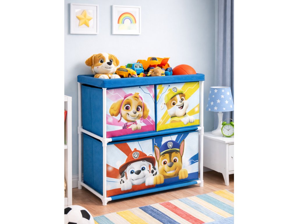 Organizér s úložnými boxy Paw Patrol. Nádherný organizér se 3 textilními nádobami, velmi praktický pomocník pro ukládání hraček, stavebnic, ale i oblečení, je zároveň i krásnou dekorací do dětského pokojíčku. Vyrobeno z kovu, polyesteru, PP a lepenkových trubek. Zabírá málo místa, montáž je rychlá a snadná. S tímto organizérem Tlapková patrola si i děti budou uklízet rády.