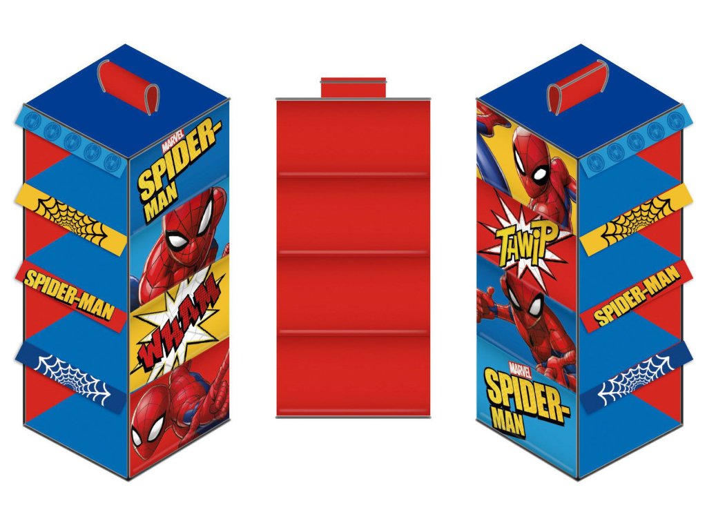 Organizér je vybaven čtyřmi prostornými přihrádkami, které umožňují snadné třídění věcí. Přední i boční strany zdobí výrazné komiksové motivy Spidermana, pavučin a akčních nápisů, takže působí hravě a dynamicky. Barevné výztuhy na policích nejen zvyšují stabilitu, ale také usnadňují přístup k uloženým věcem.
